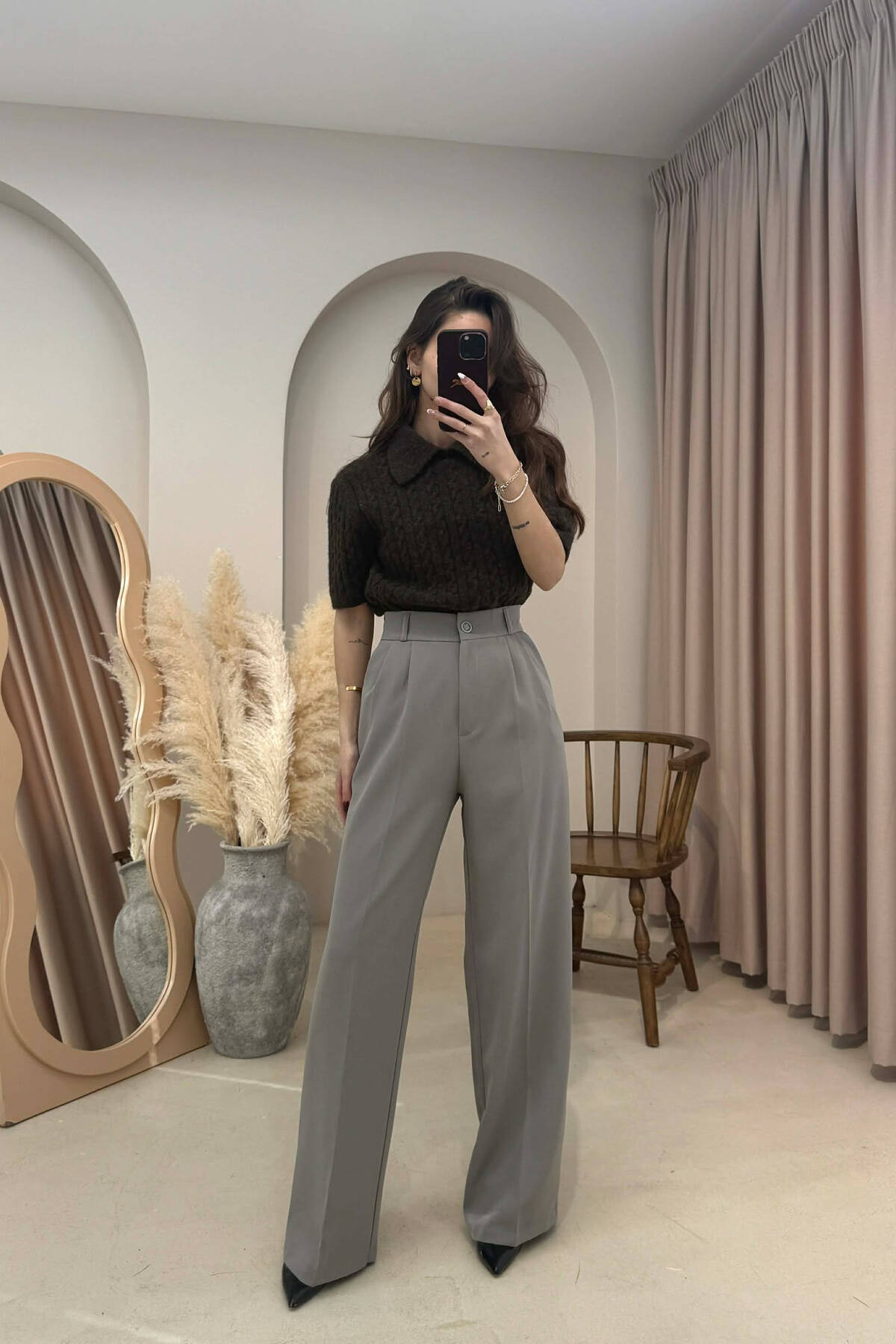PANTALLONA NJE NGJYRESHE ME BEL GJYSEM ELASTIK PER FEMRA NE NGJYRE KAFE