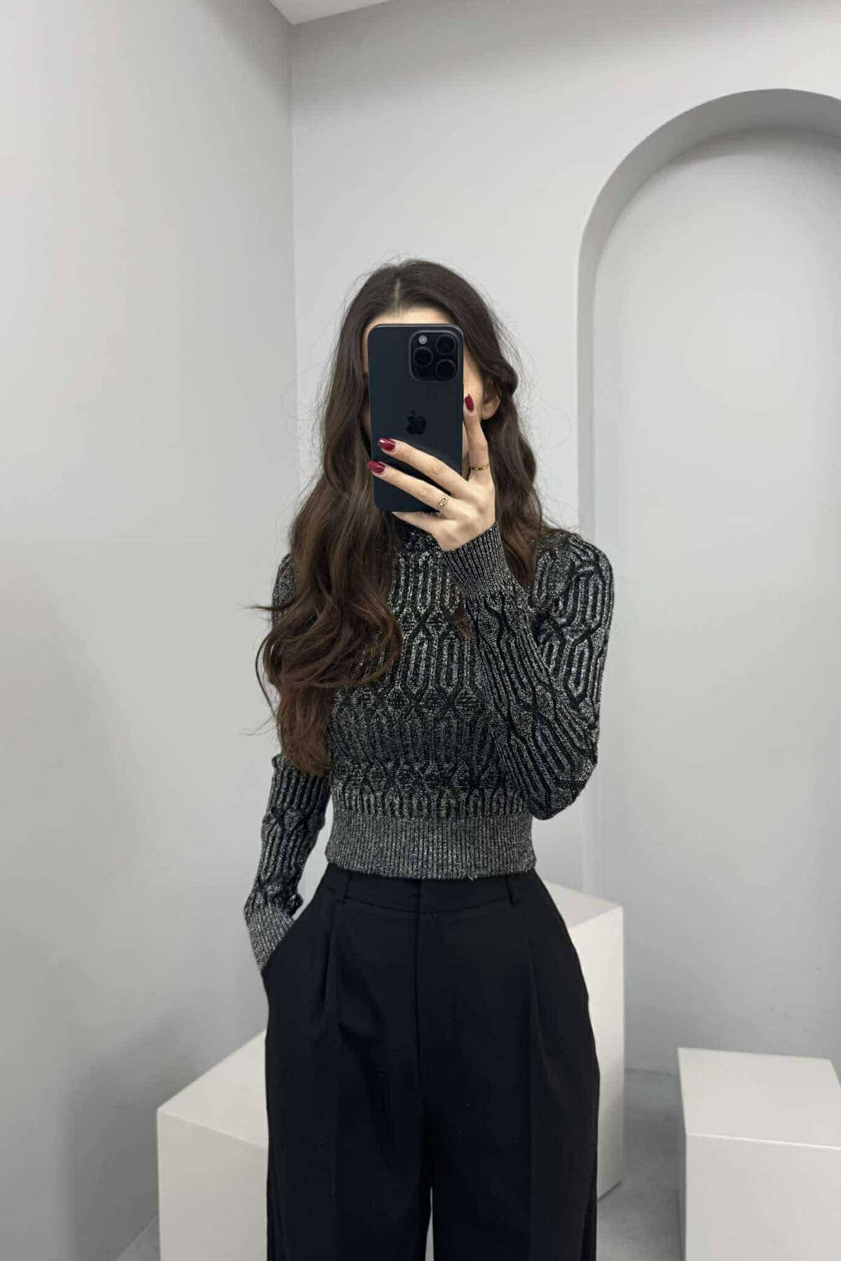 RHOMBUS DESIGN ROUND NECK WOMEN SWEATER BLACK/ E ZEZE