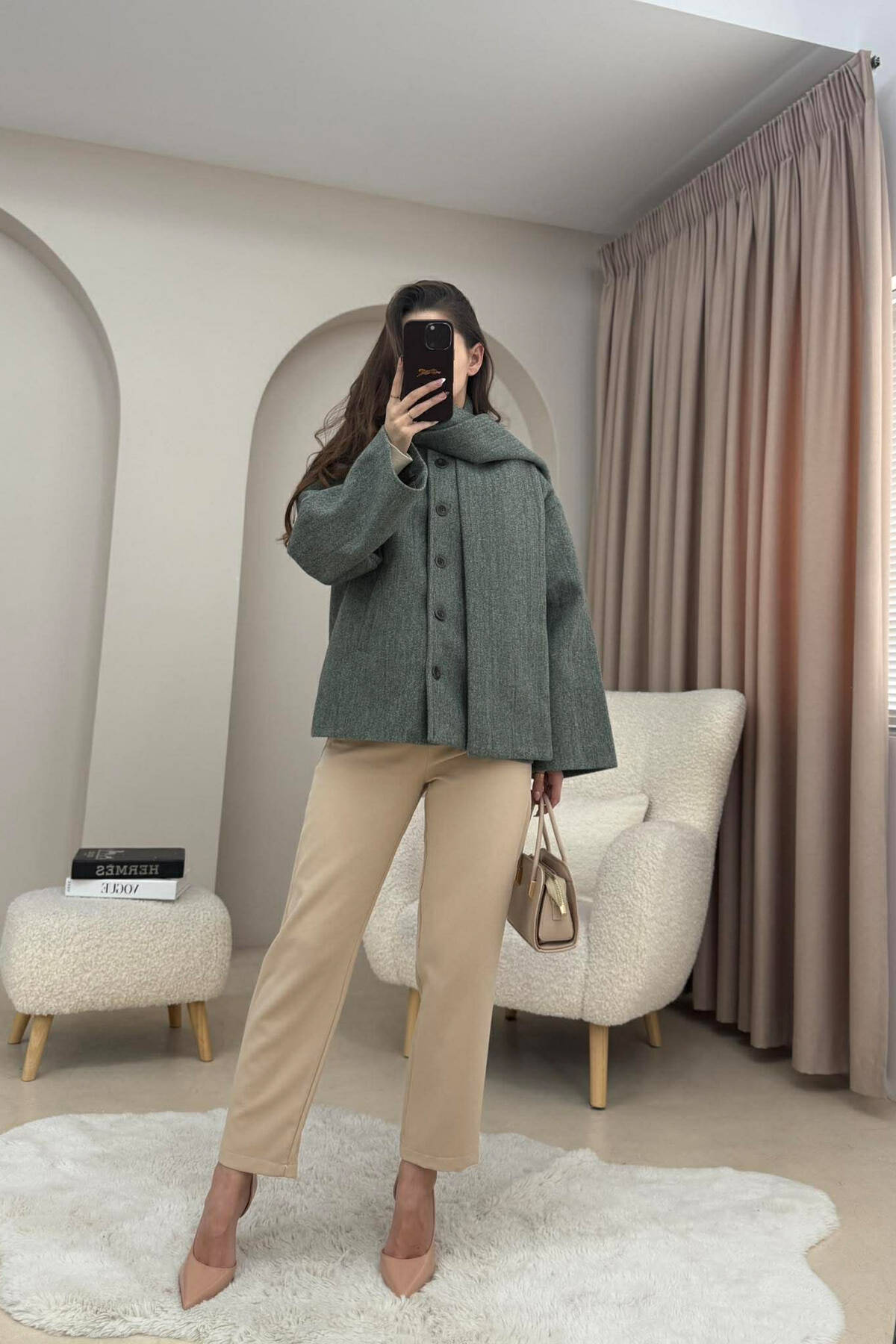 ONE COLOR SIMPLE BUTTONED WOMAN COAT WITH SCARF BEIGE/BEZHE