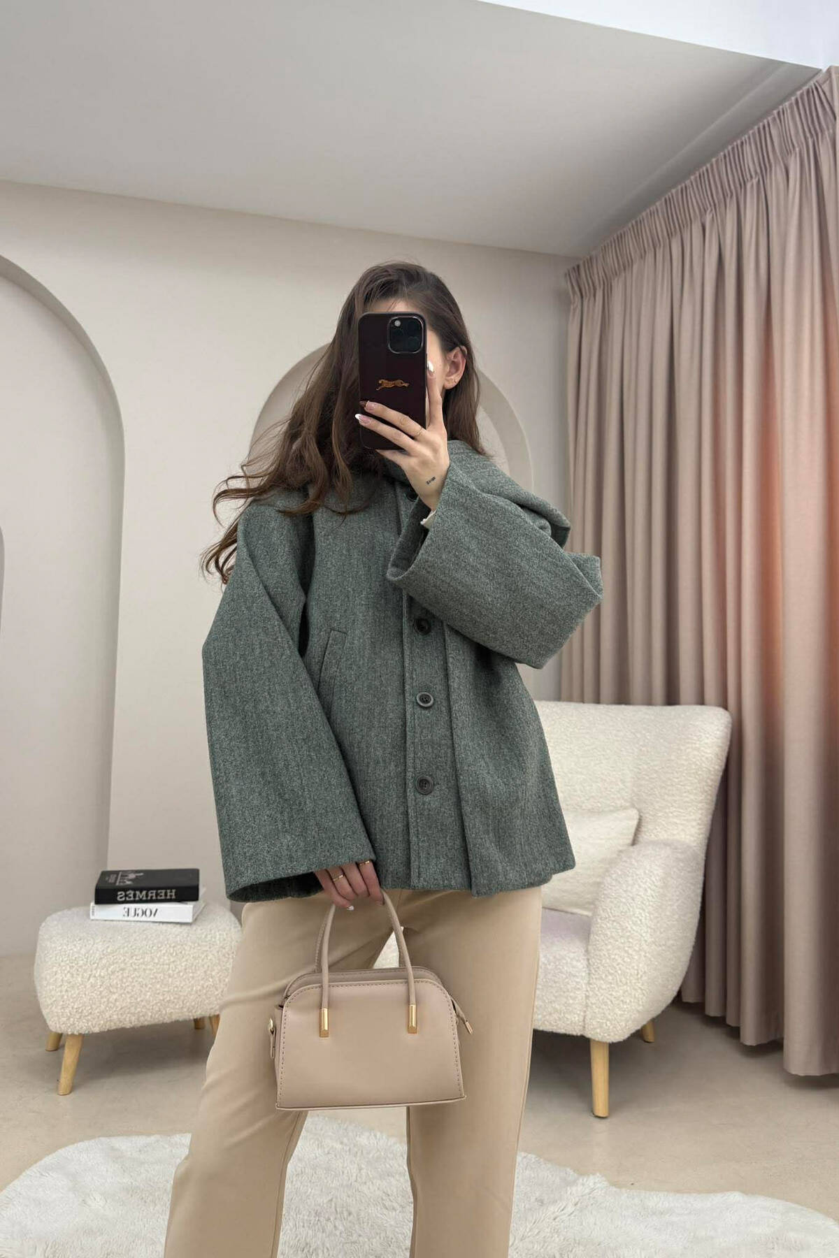 DETACHABLE FAUX FUR COLLAR CROPPED WOMAN COAT CREAM/KREM