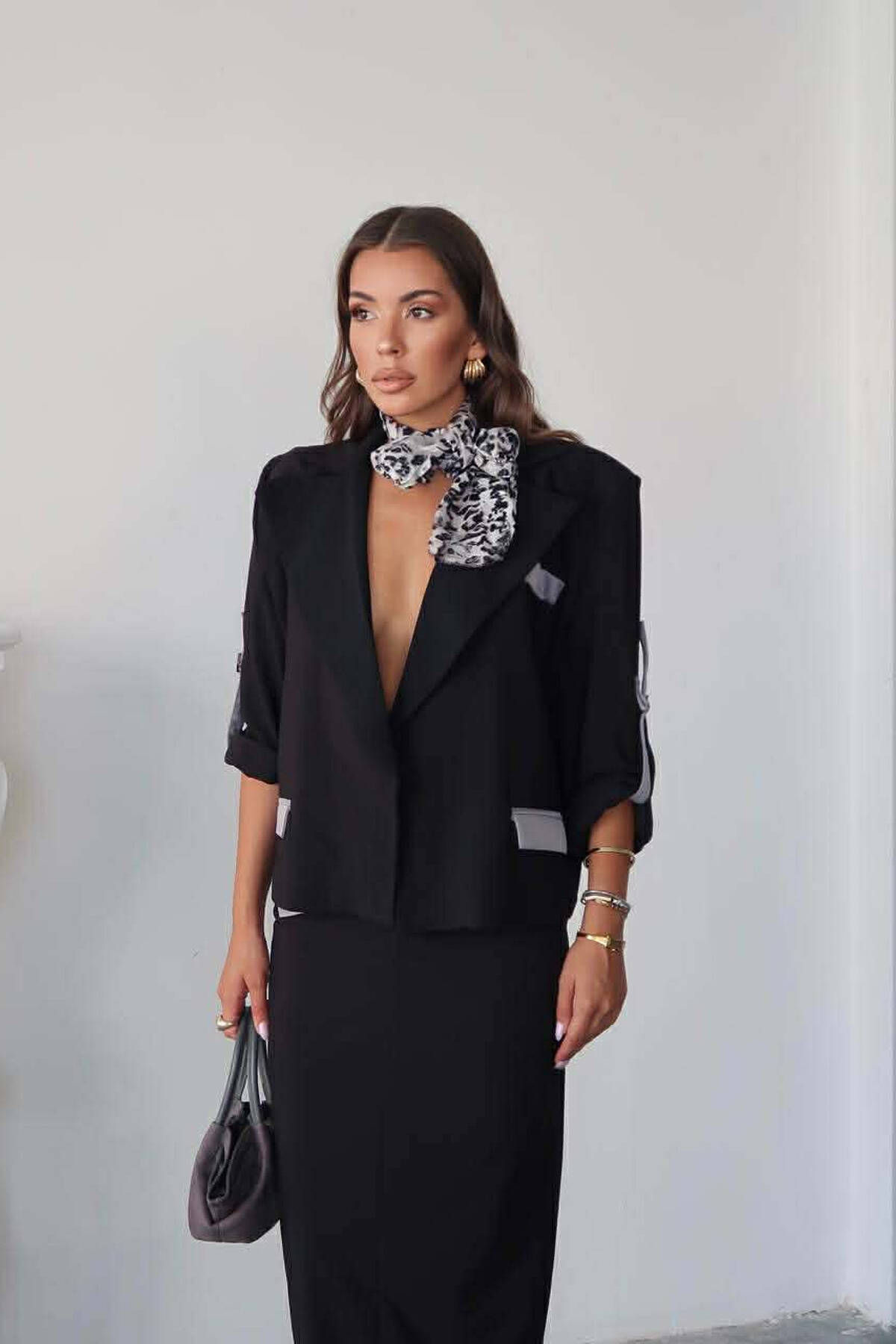 ONE COLOR CROPPED JACKET+SKIRT WOMEN SET BLACK/ E ZEZE