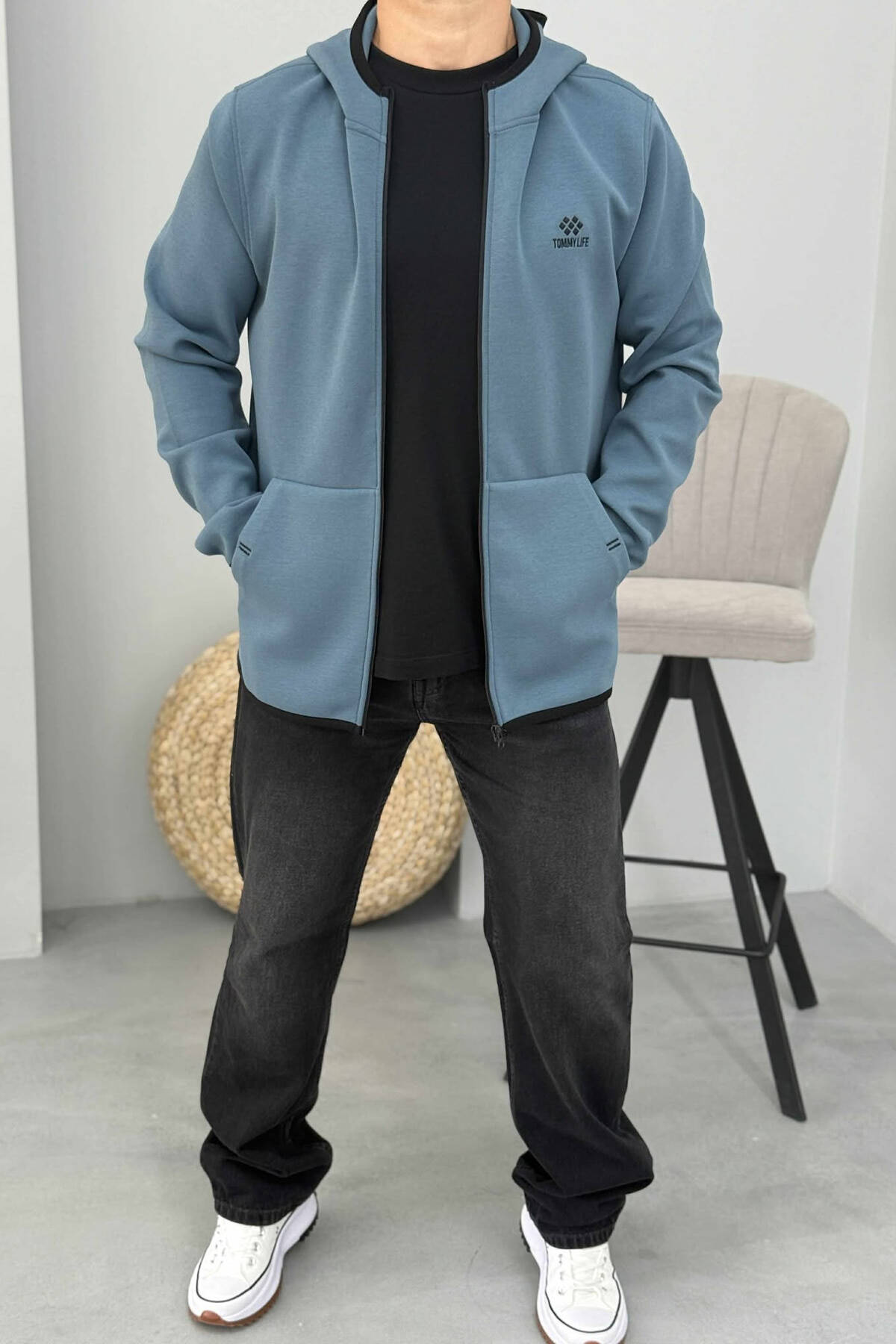 ONE COLOR HOOD ZIPPER MEN COTTON JACKET LIGHTBLUE/BZ
