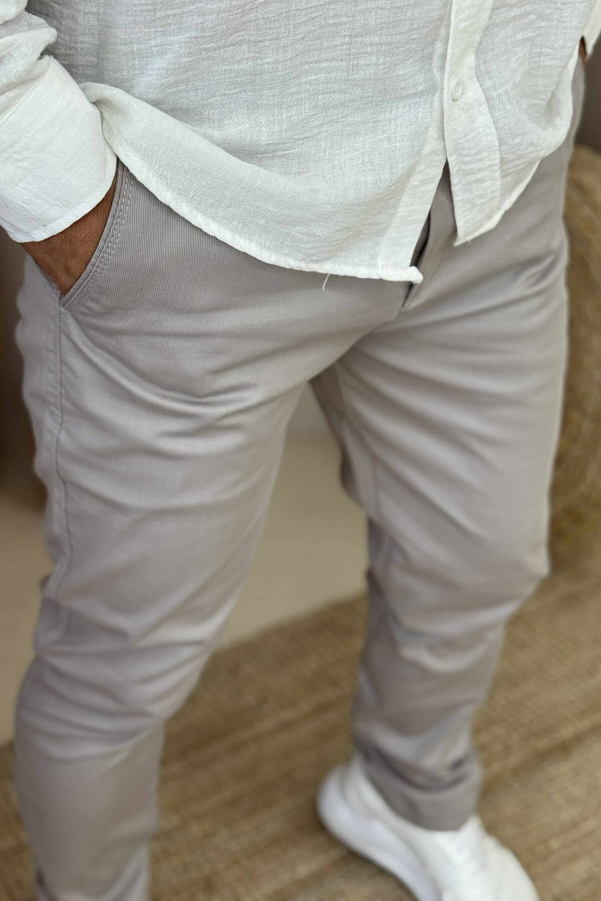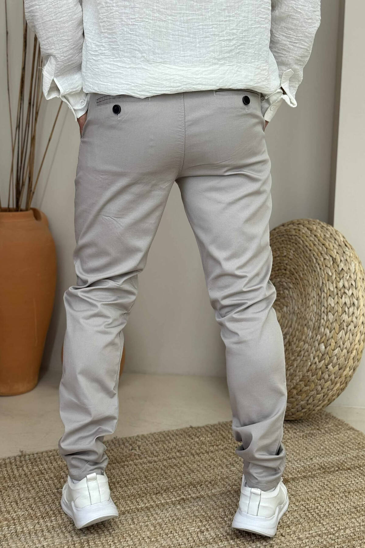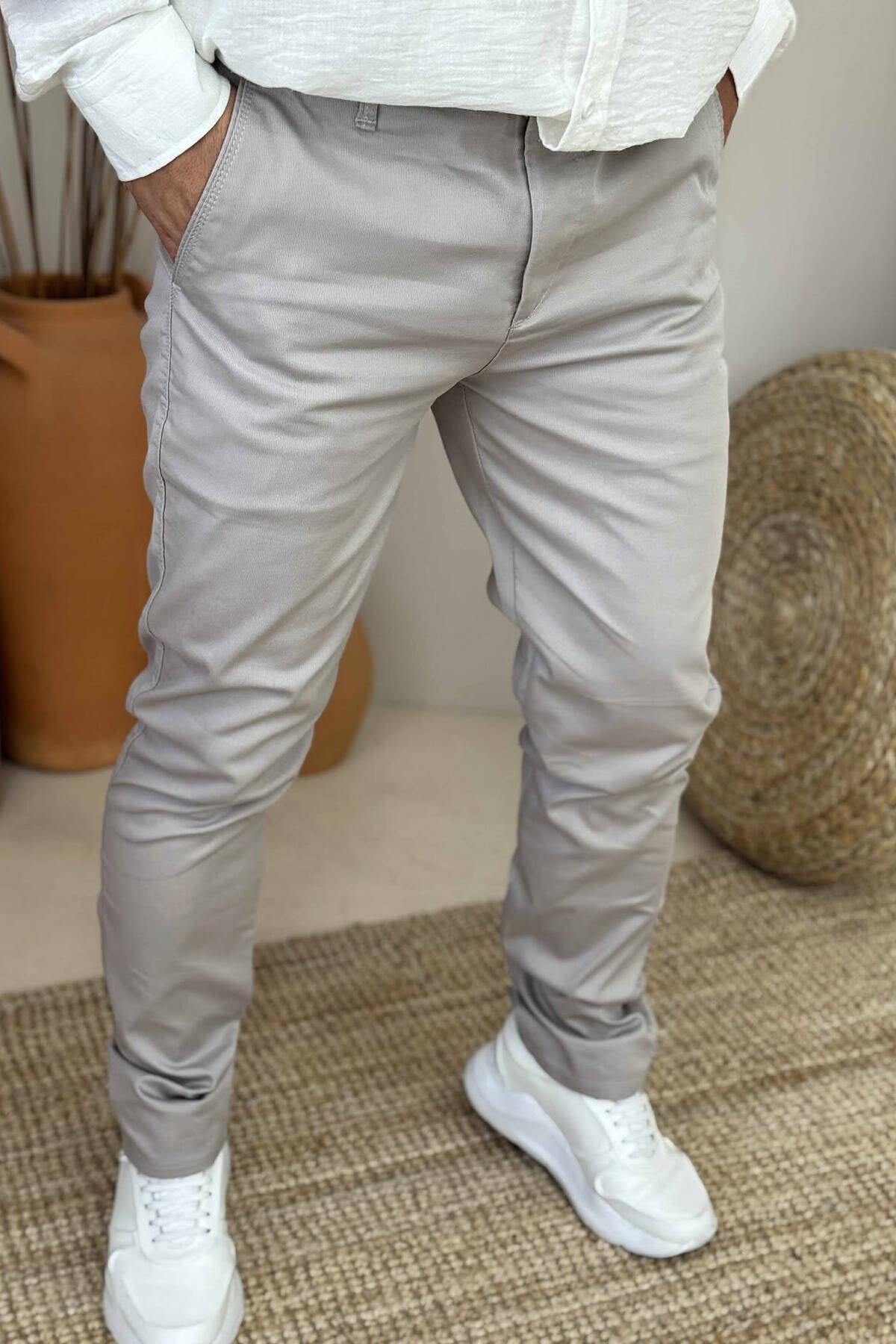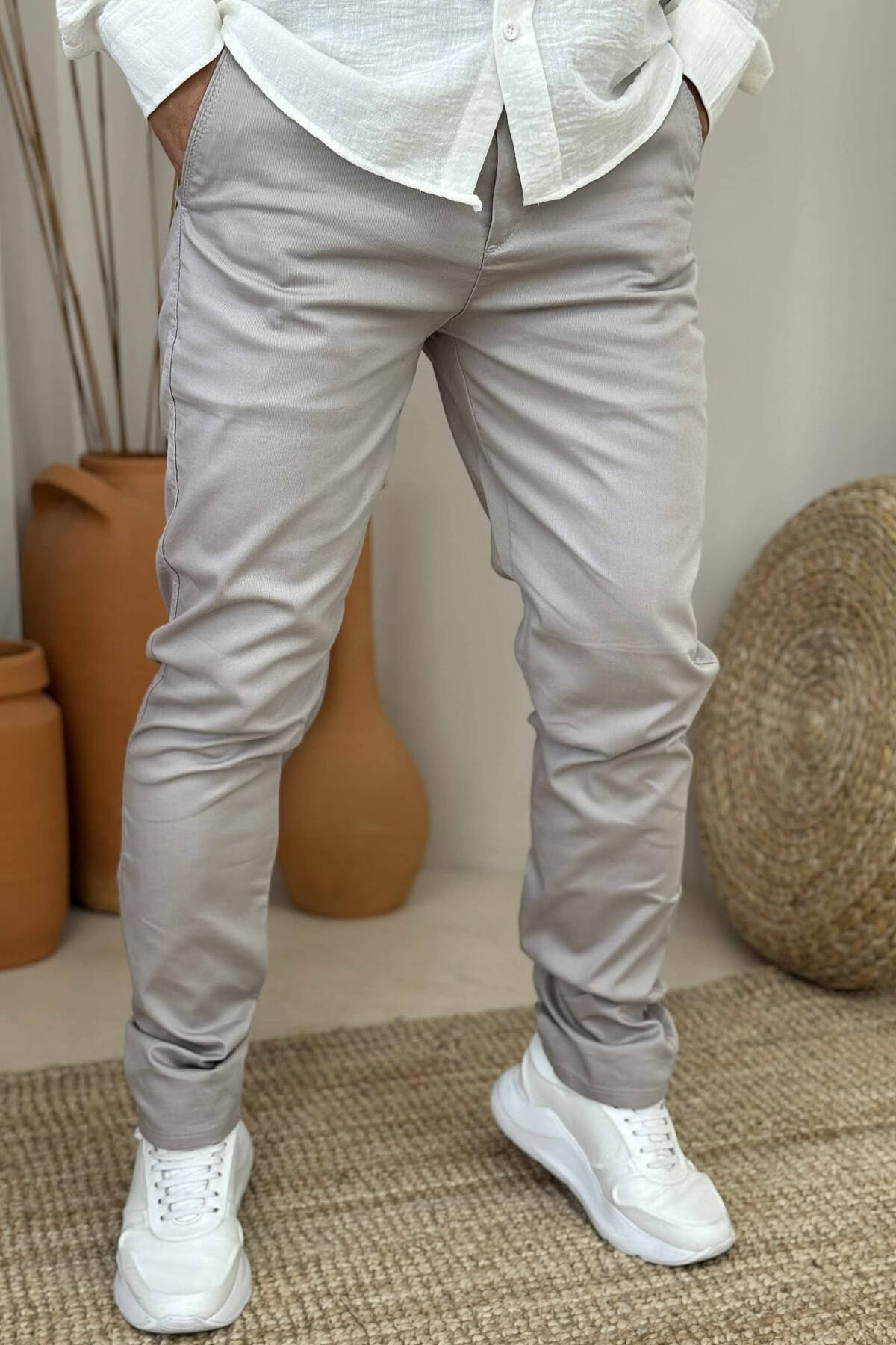 PANTALLONA NJË NGJYRËSHE TË THJESHTA PËR MESHKUJ NË NGJYRËN GRI E ZBARDHUR