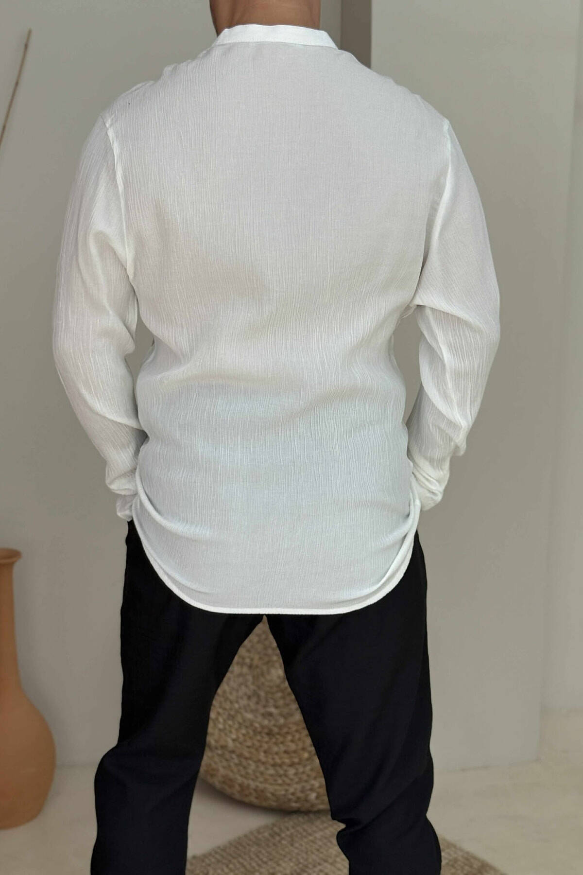 BLUZË NJËNGJYRËSHE ME JAKË TË RRUMBULAKËT DHE ME BUTONA PËR MESHKUJ NË NGJYRËN E BARDHË