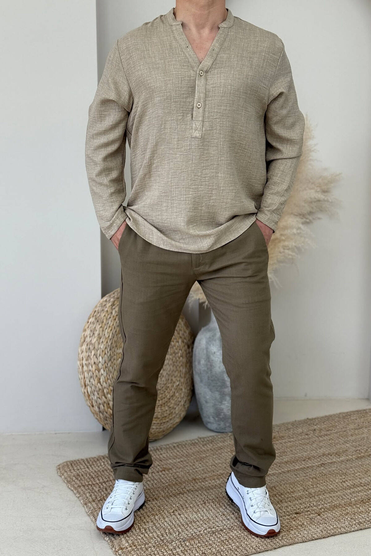 ROUND BUTTONED NECK ONE COLOR MEN SHIRT BEIGE/BEZHE