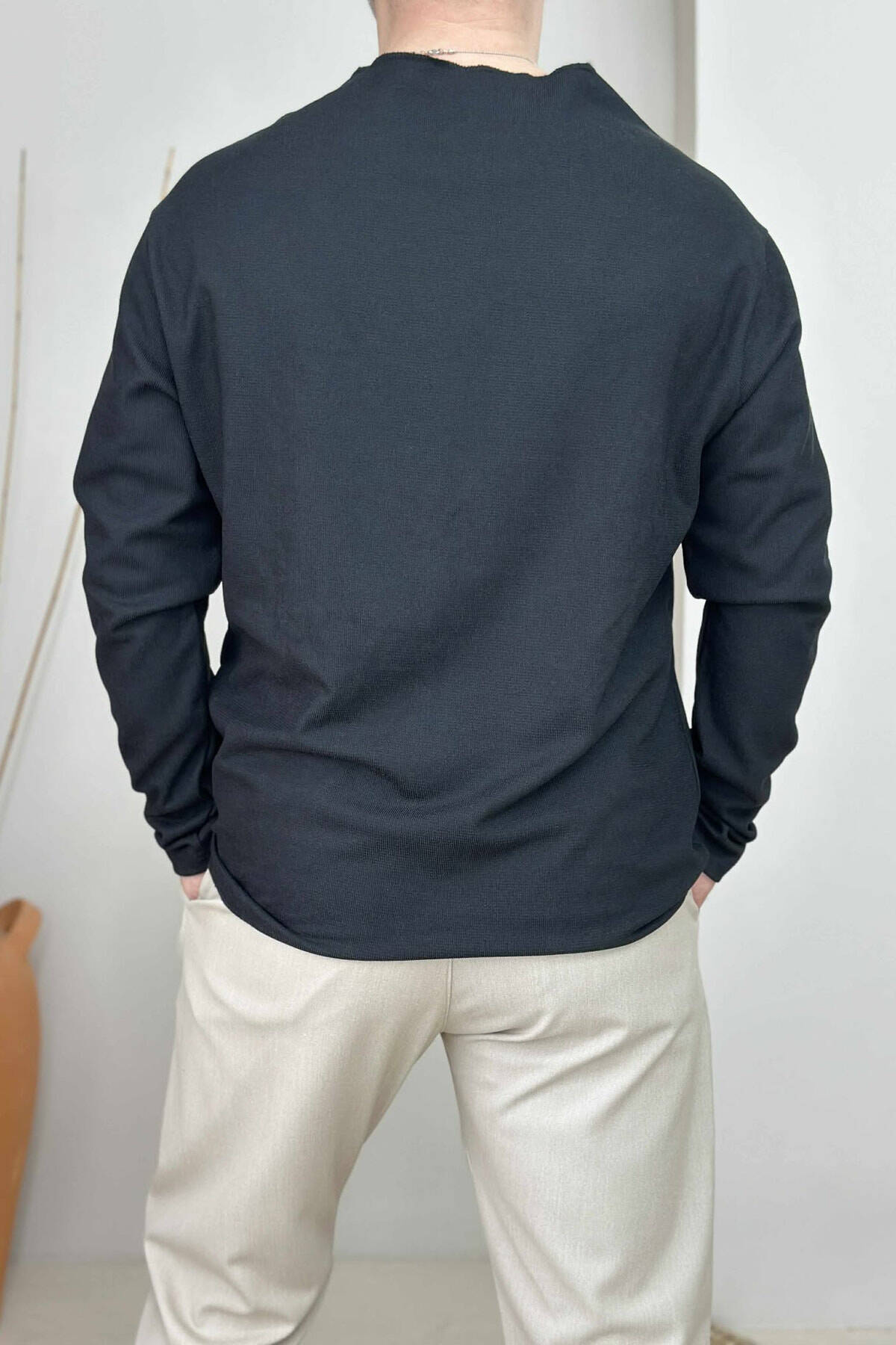 BLUZË ME JAKË RRUMBULLAKE DHE ME DIZAJN NE PJESËN PARA PËR MESHKUJ NË NGJYRËN BLU TË ERRËT