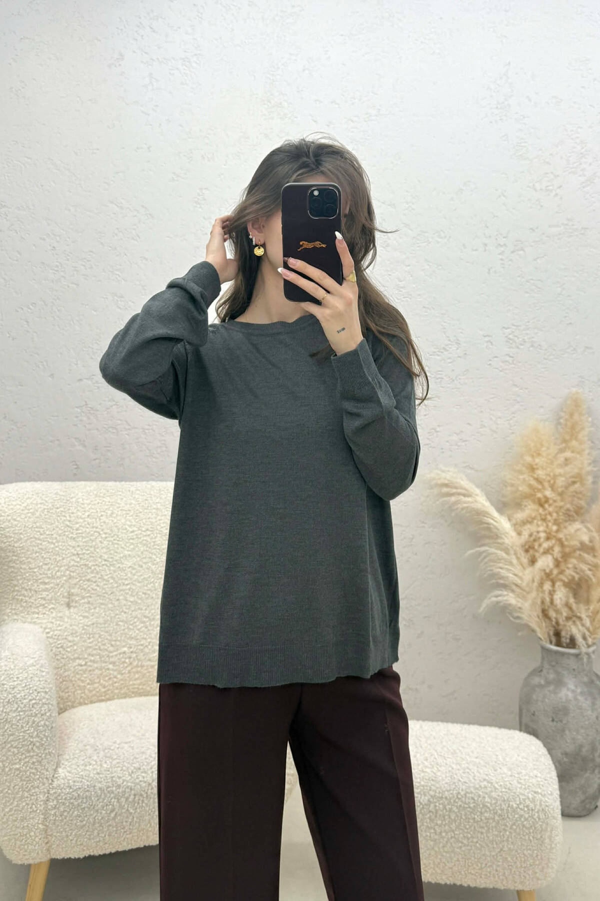 ONE COLOR SIMPLE ROUND NECK WOMEN SWEATER DARK GREY/GEE