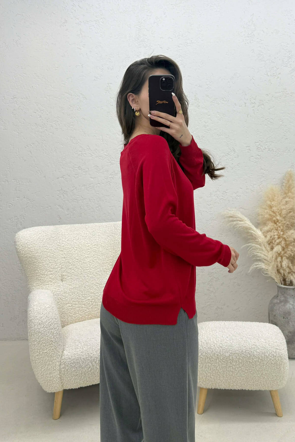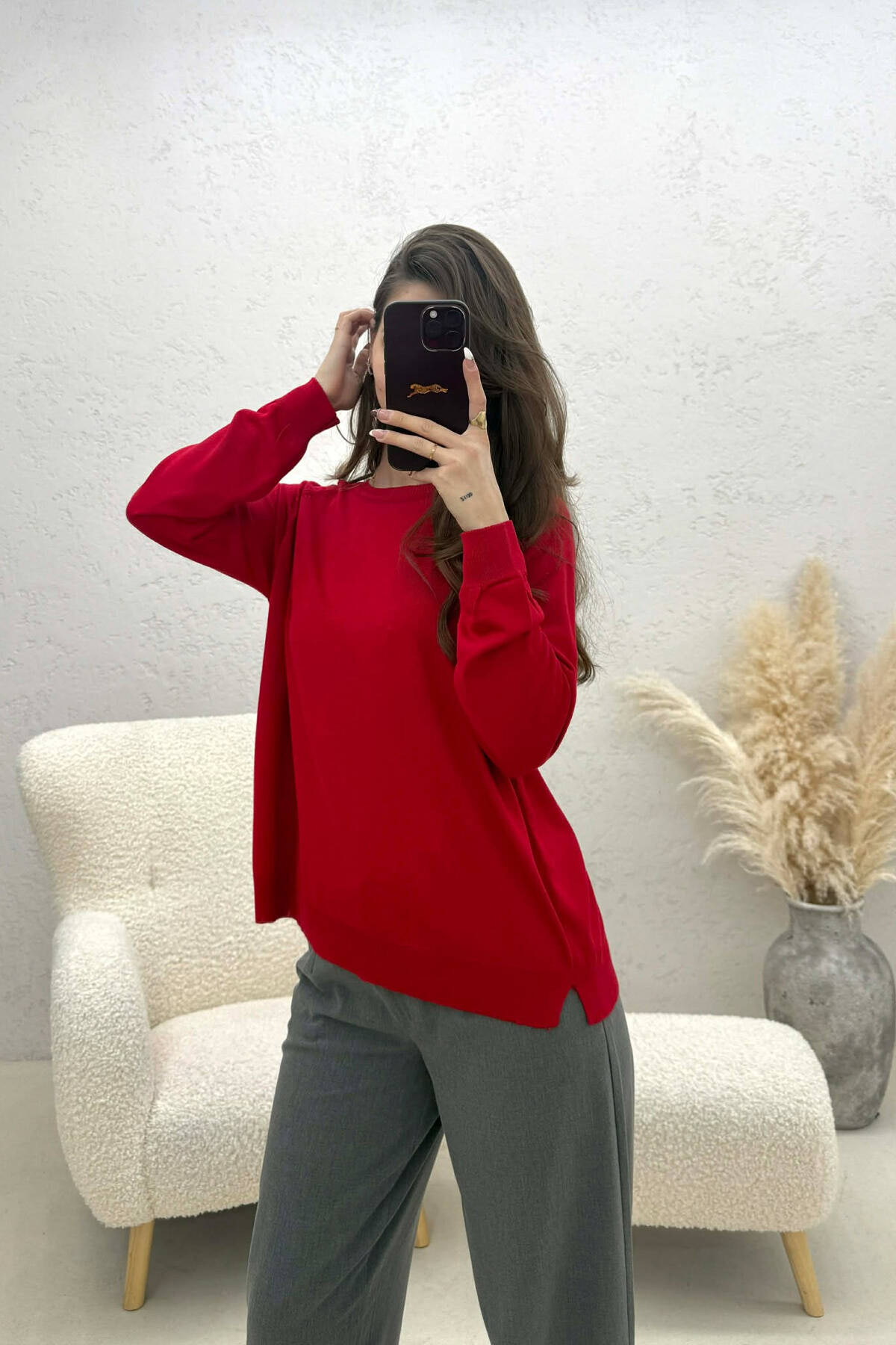 ONE COLOR SIMPLE ROUND NECK WOMEN SWEATER RED/E KUQE