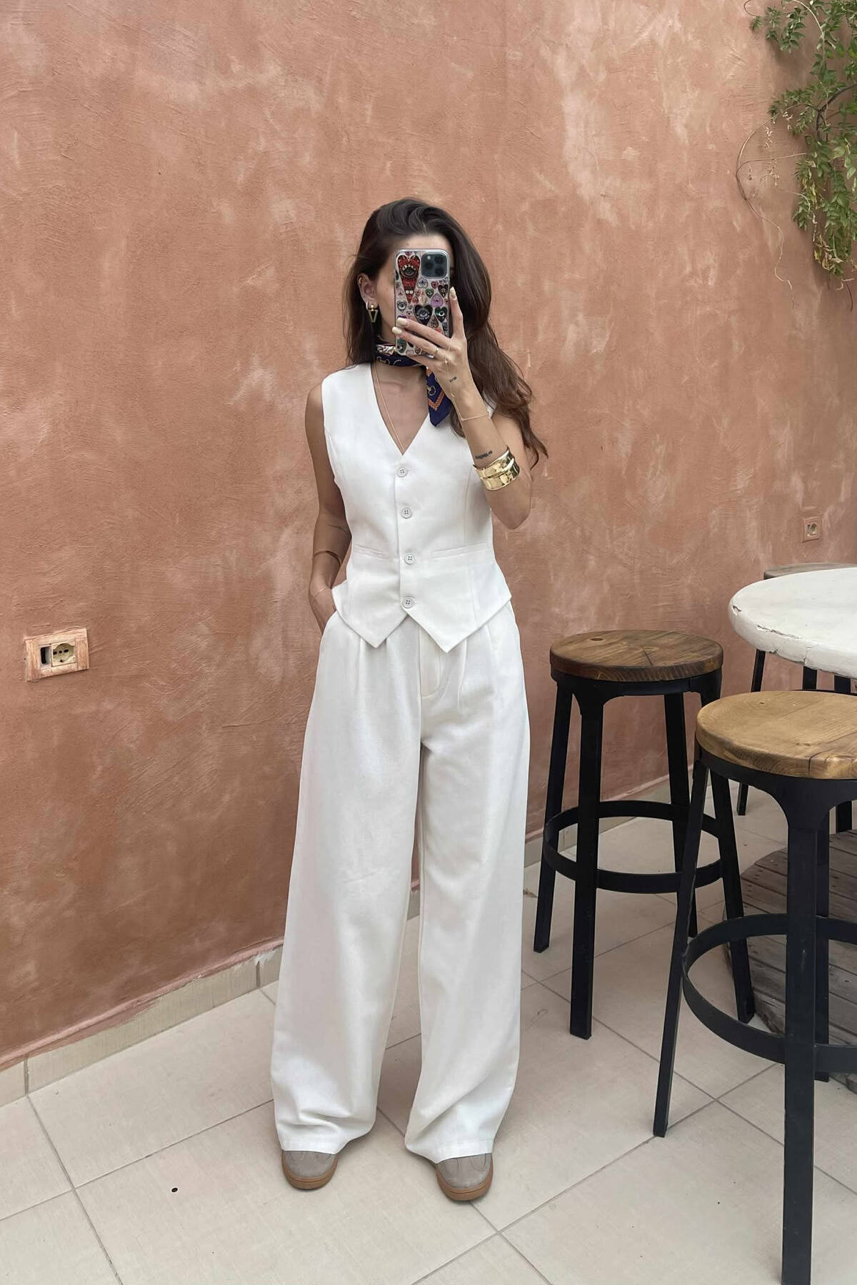 SCARF BELT DETAIL VEST + TROUSERS DENIM WOMAN SET BROWN/KAFE
