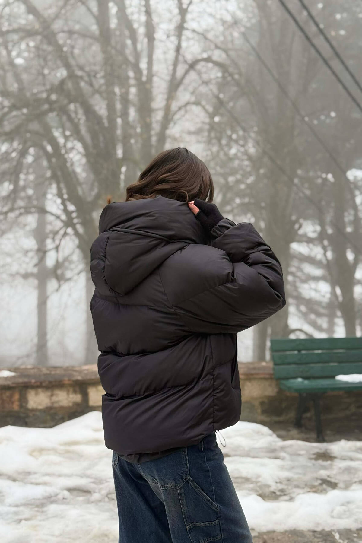 ONE COLOR HOODED ZIPPER CROPPED WOMAN PUFFER JACKET DARK BROWN/KAE