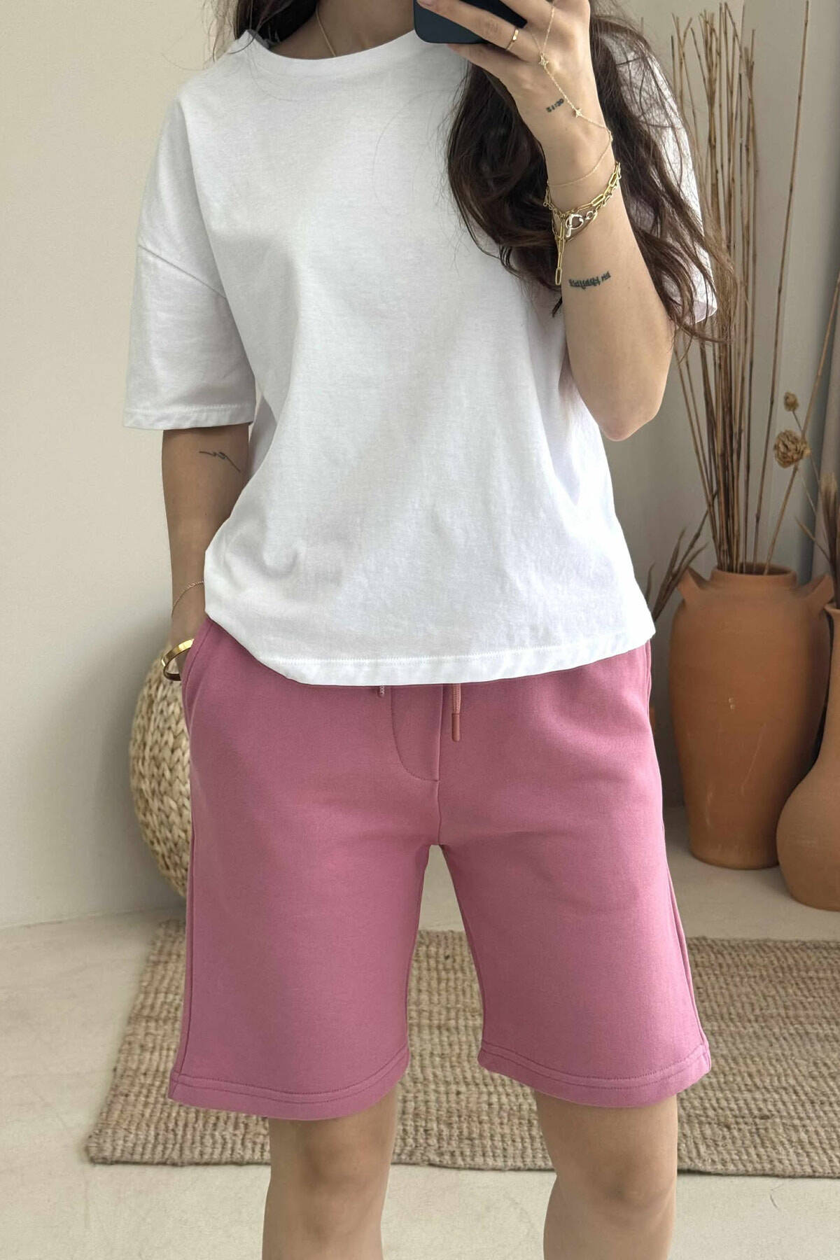 ONE COLOR SIMPLE WOMEN SHORT SWEATPANTS POWDER/PUDER