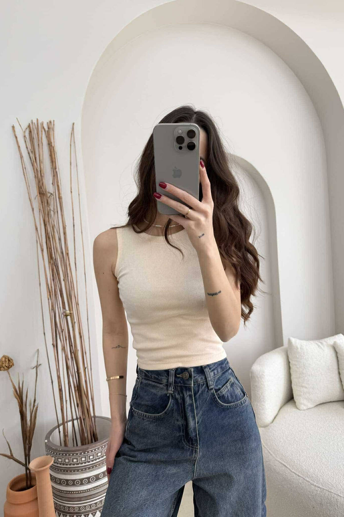 ONE COLOR HIGH NECK WOMAN TANK TOP CREAM/KREM