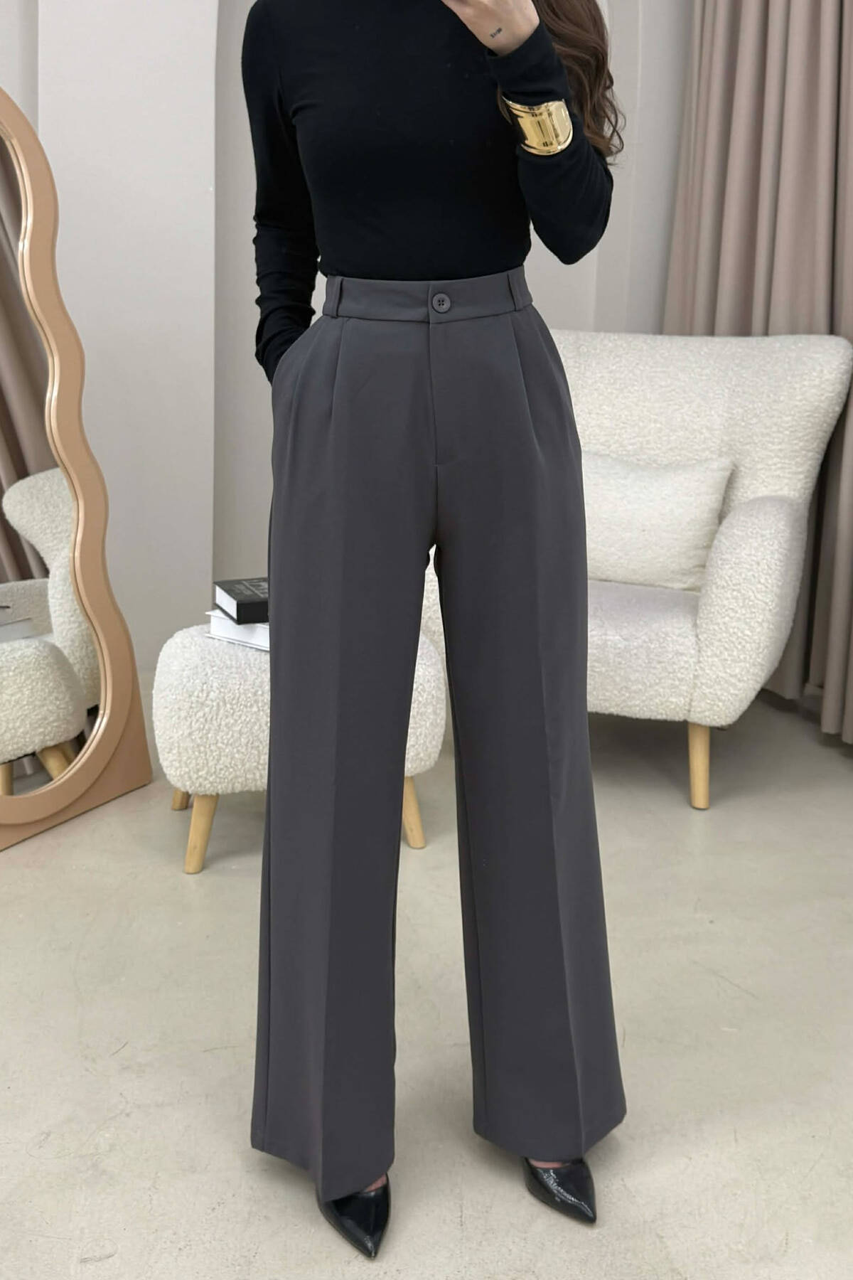 ONE COLOR WIDE LEG WOMAN TROUSERS DARK GREY/GEE