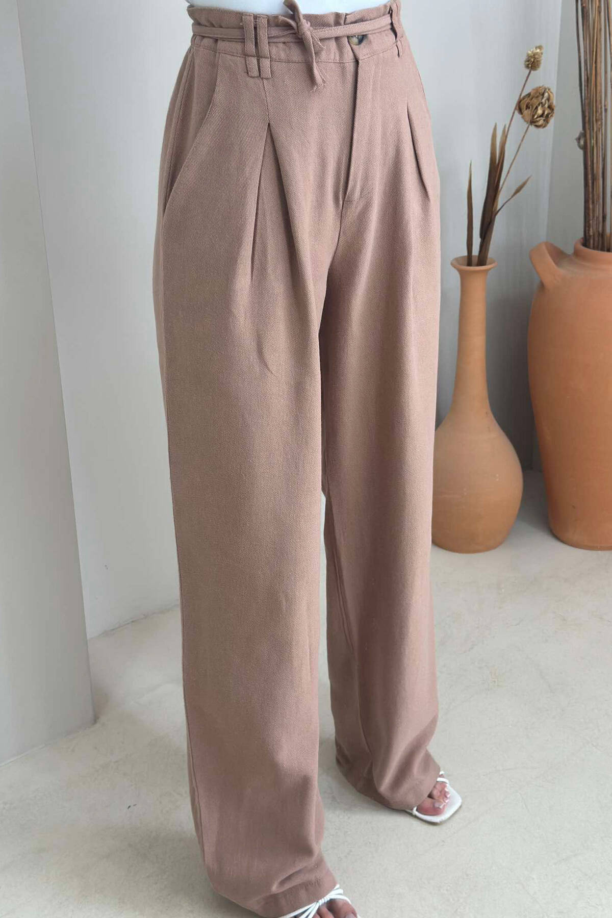 ONE COLOR BELT DETAIL WOMAN TROUSERS BROWN/KAFE