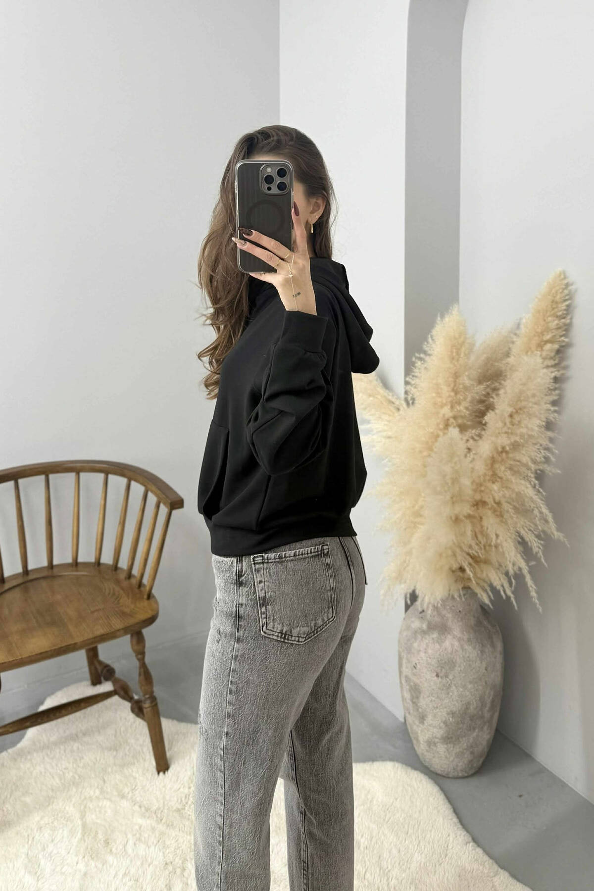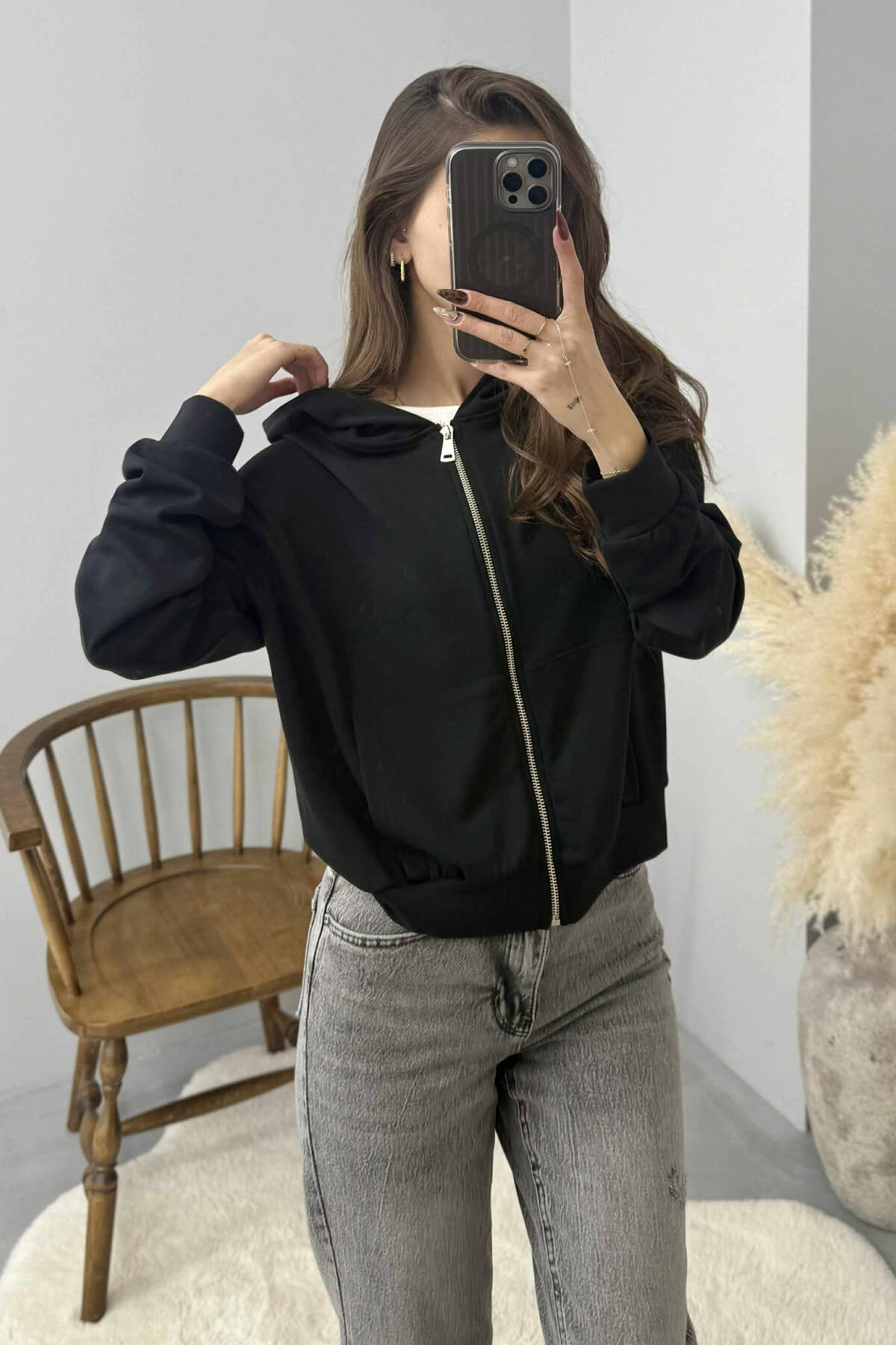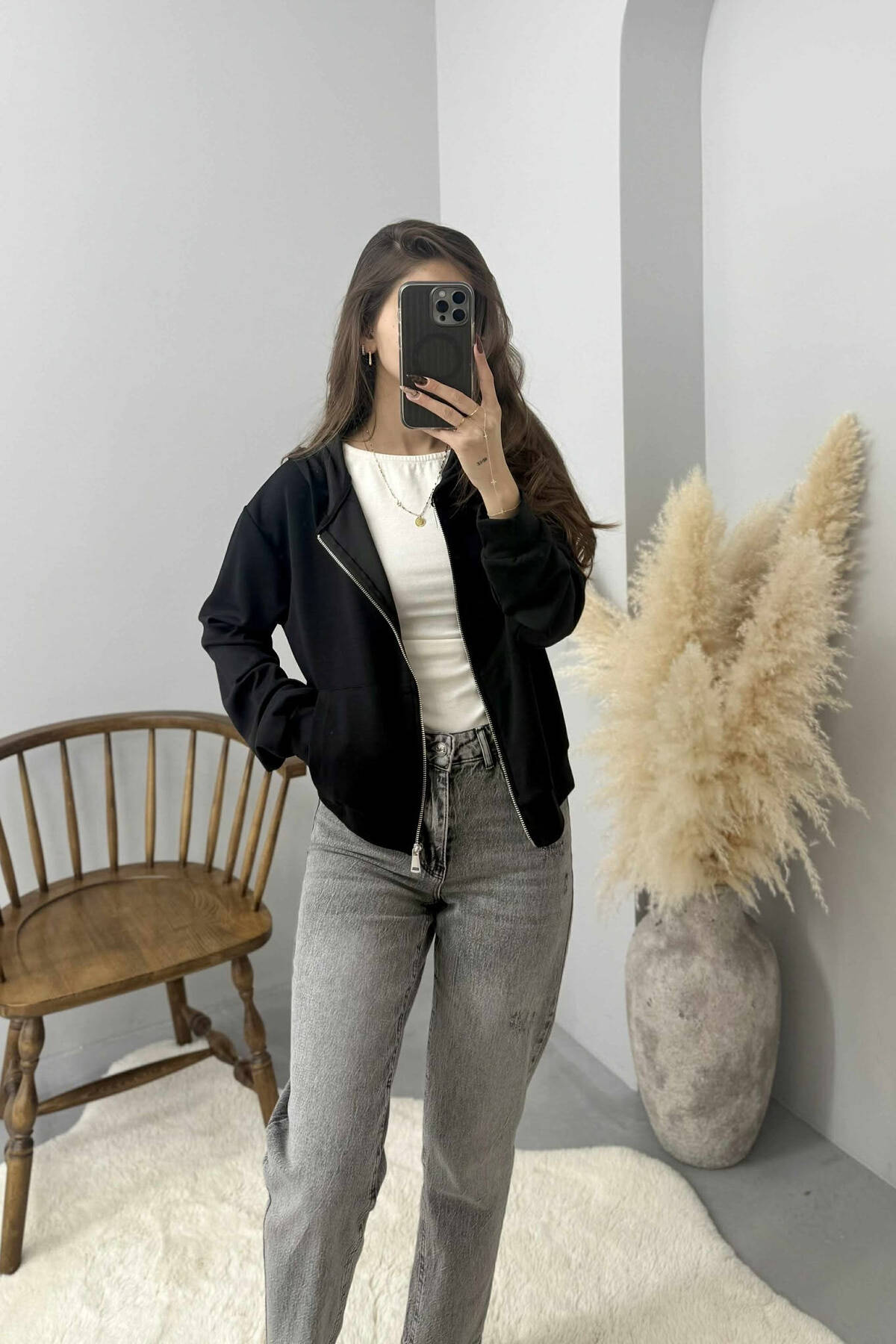 XHAKETE E THJESHTE NJE NGJYRESHE ME KAPUÇ DHE ZINXHIR PER FEMRA NE NGJYRE TE ZEZE