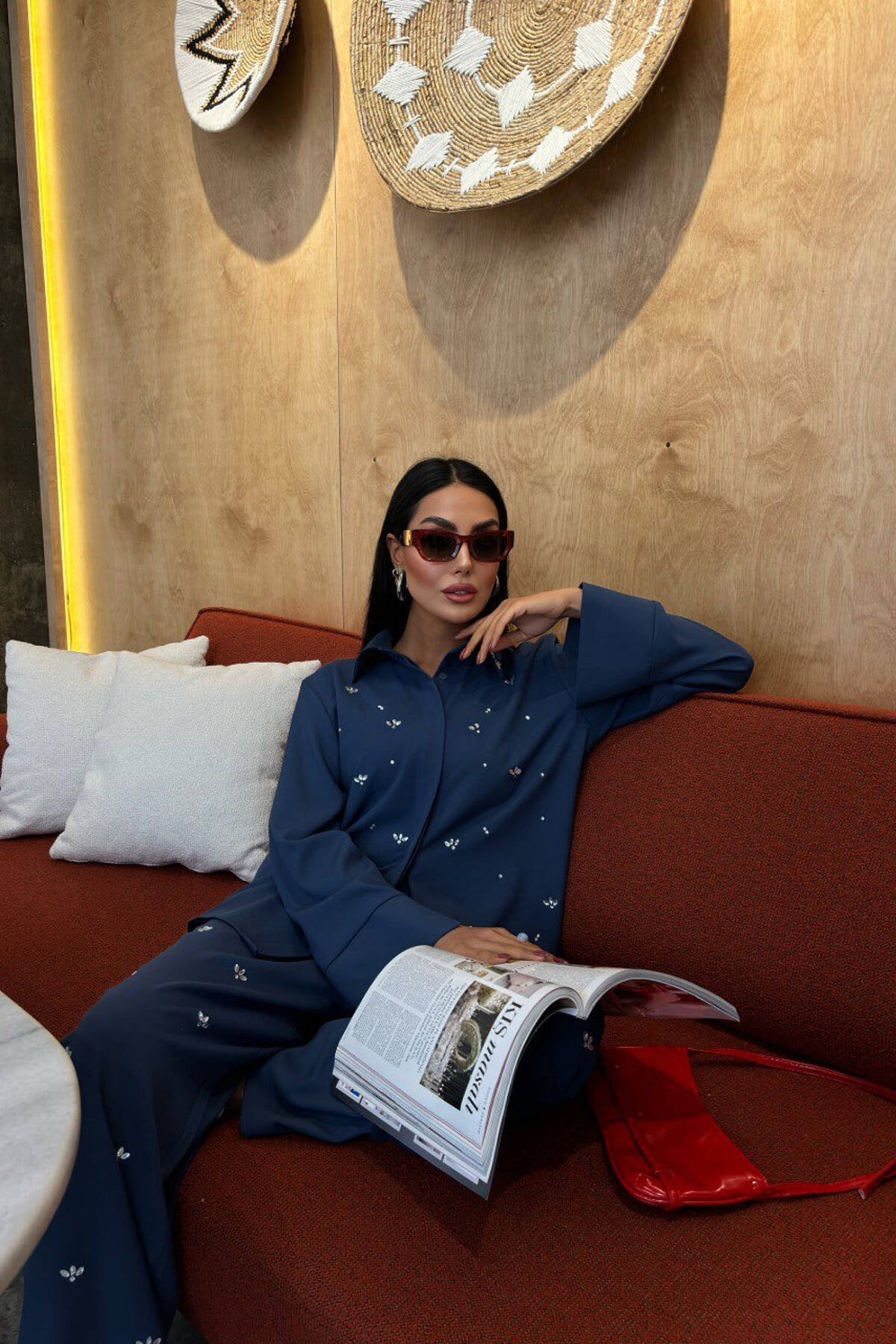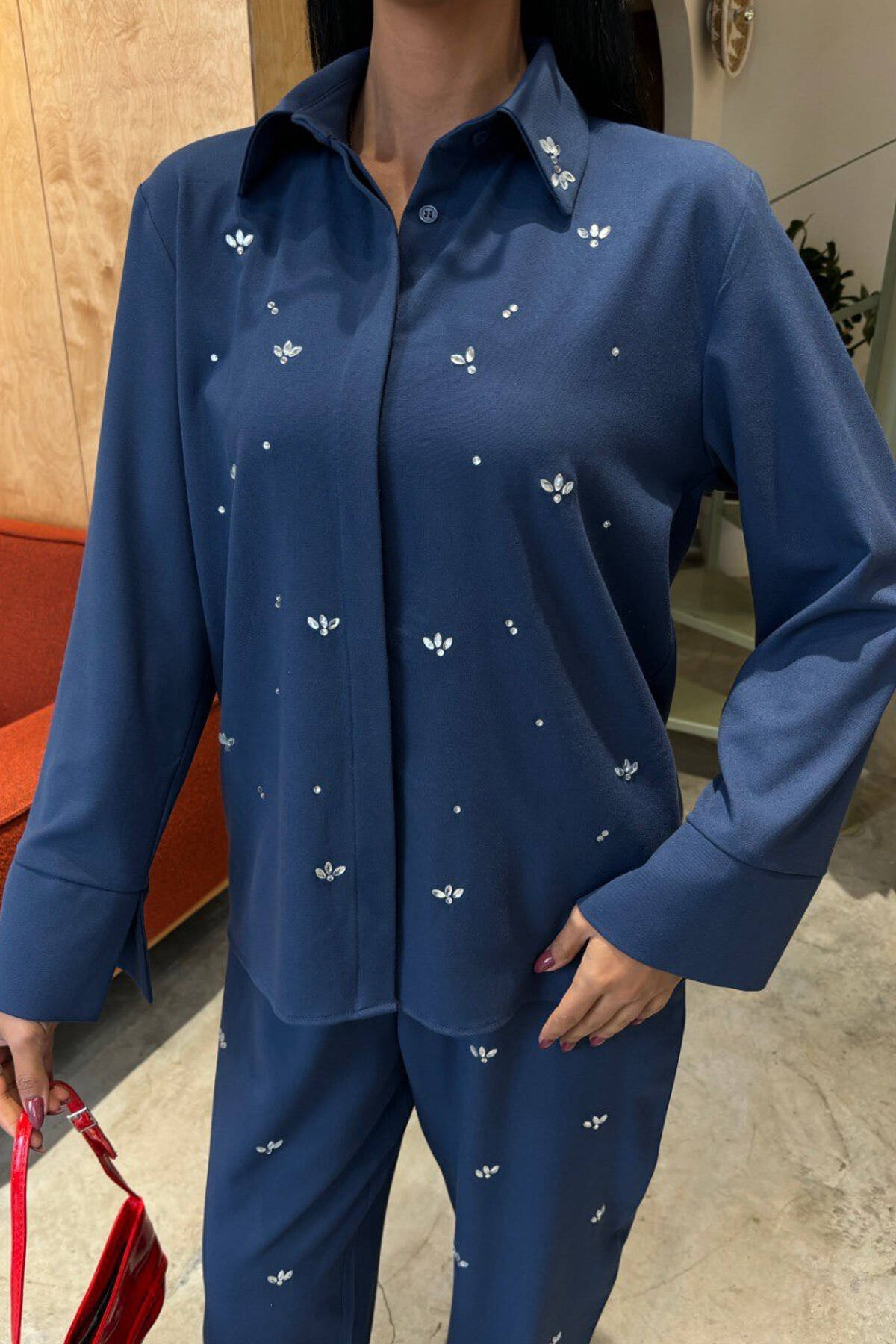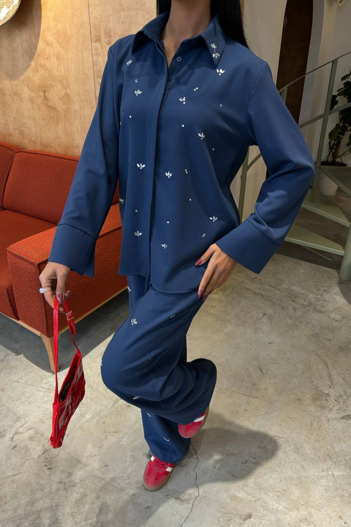 ONE COLOR STONE DETAILS SHIRT+TROUSERS WOMEN SET BLUE/BLU
