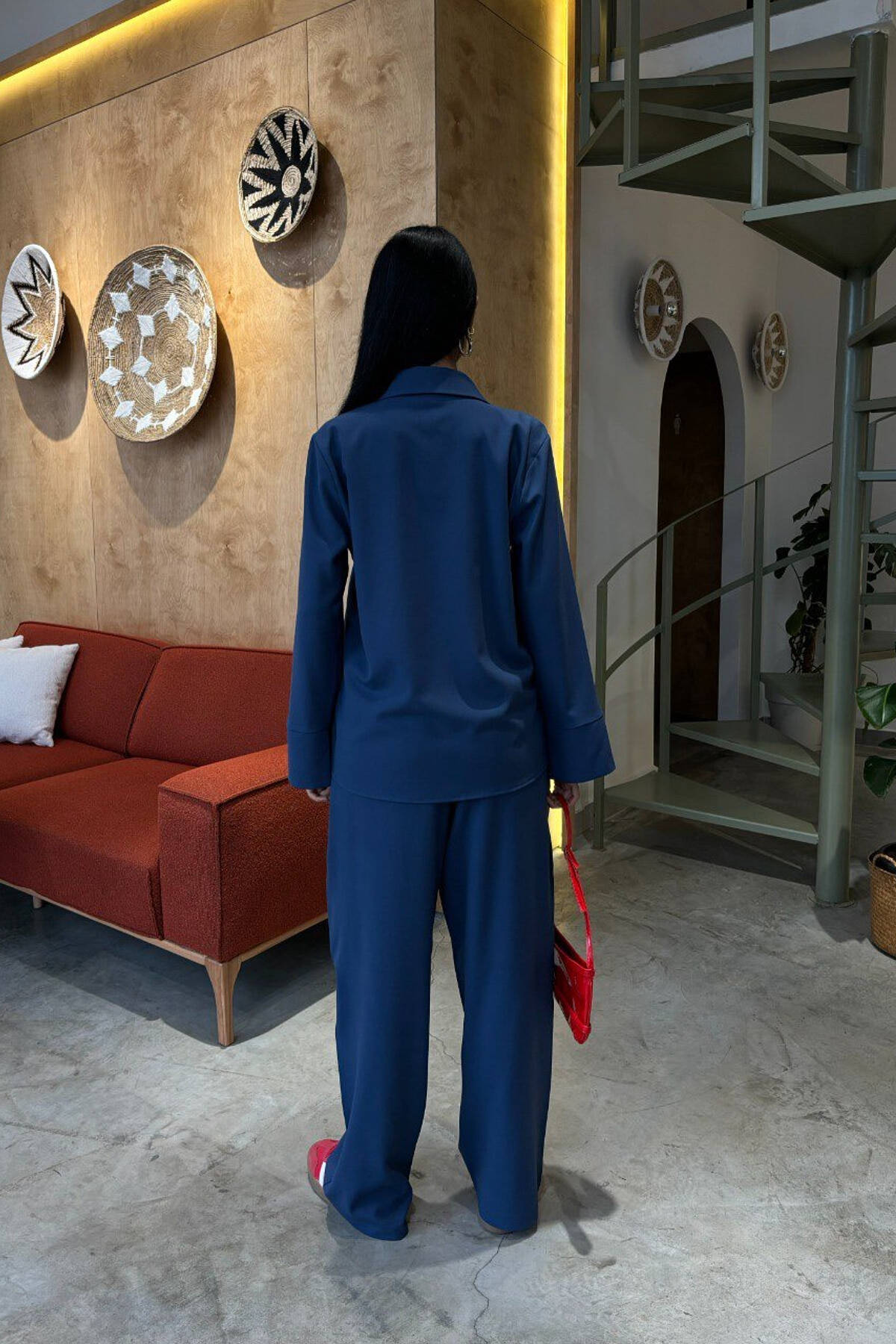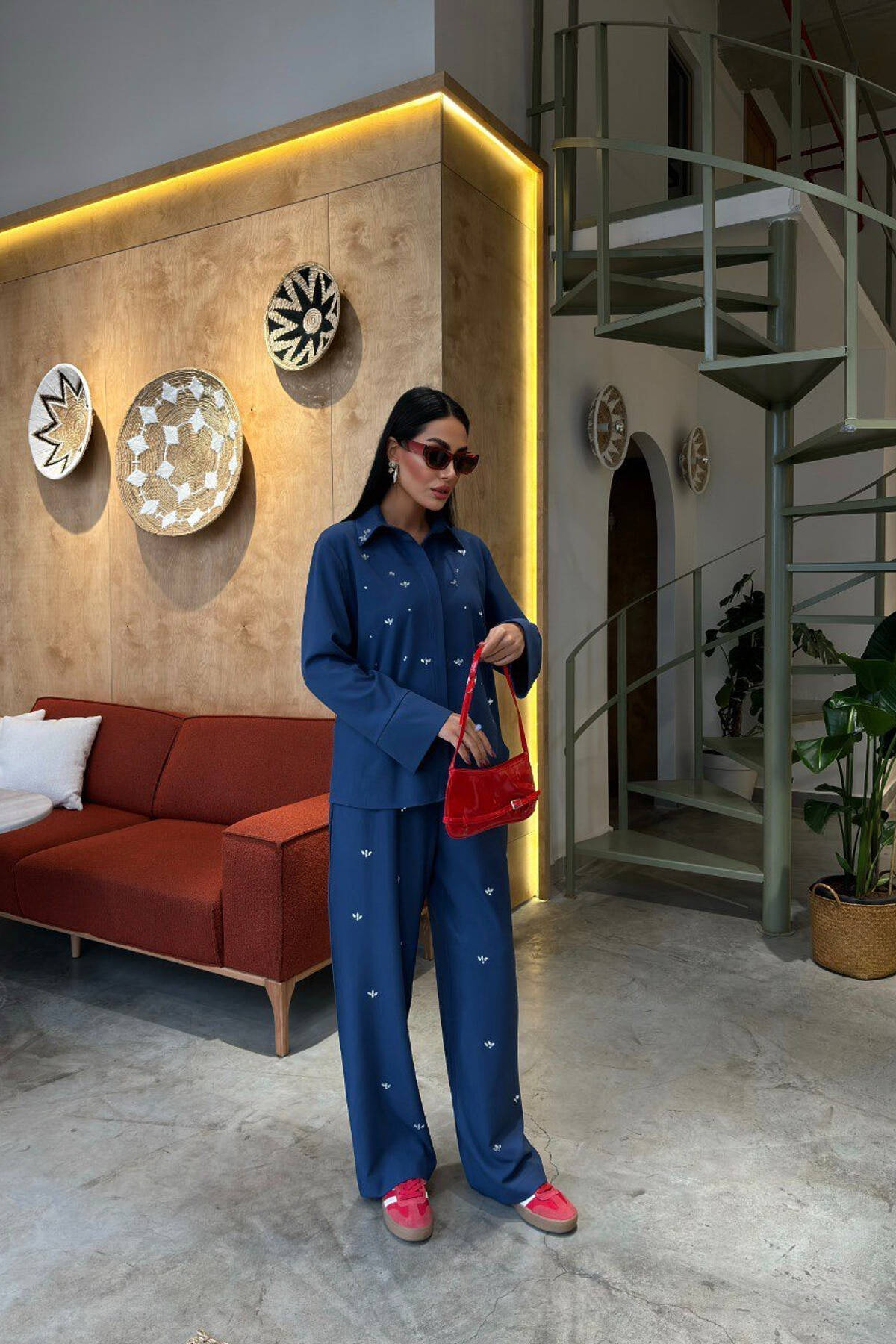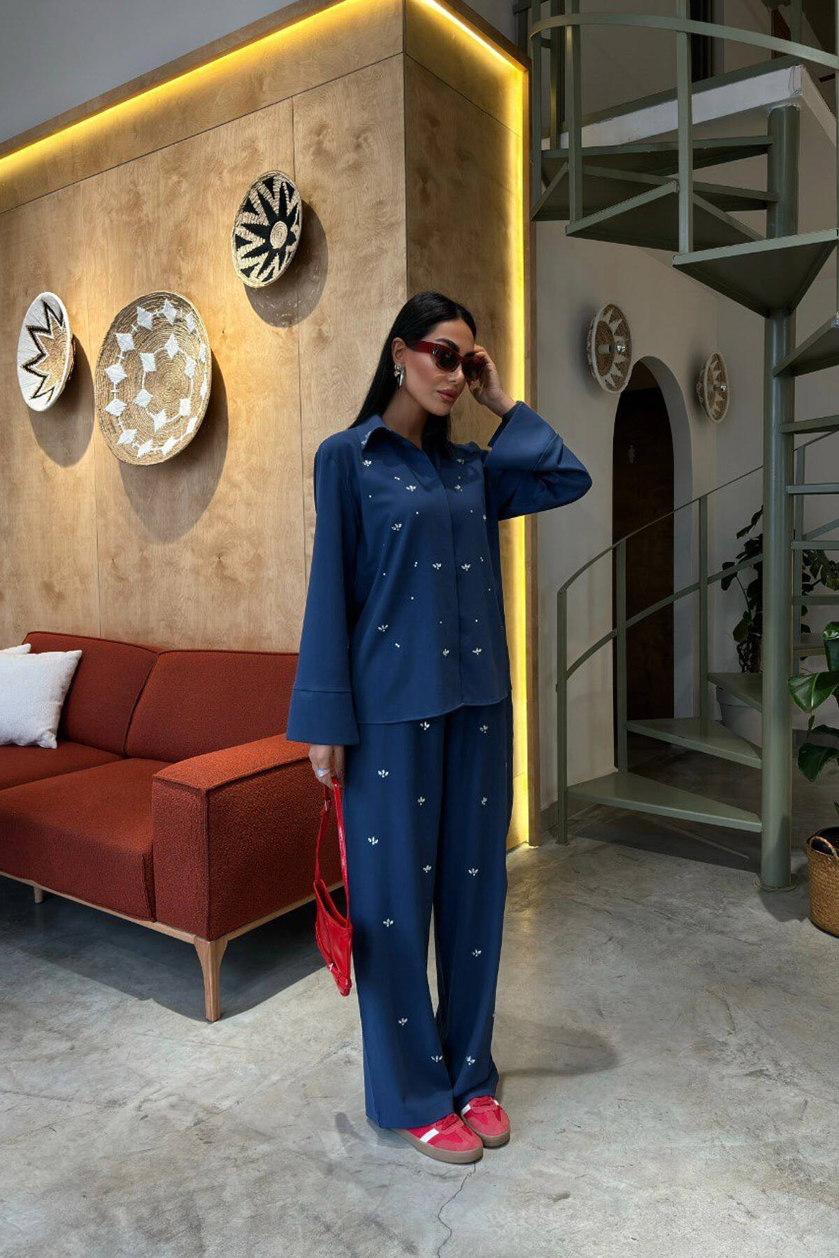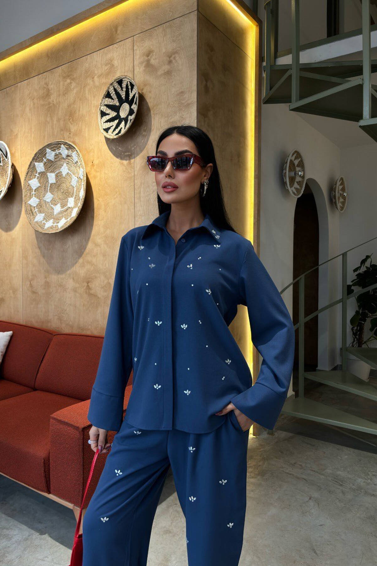ONE COLOR STONE DETAILS SHIRT+TROUSERS WOMEN SET BLUE/BLU
