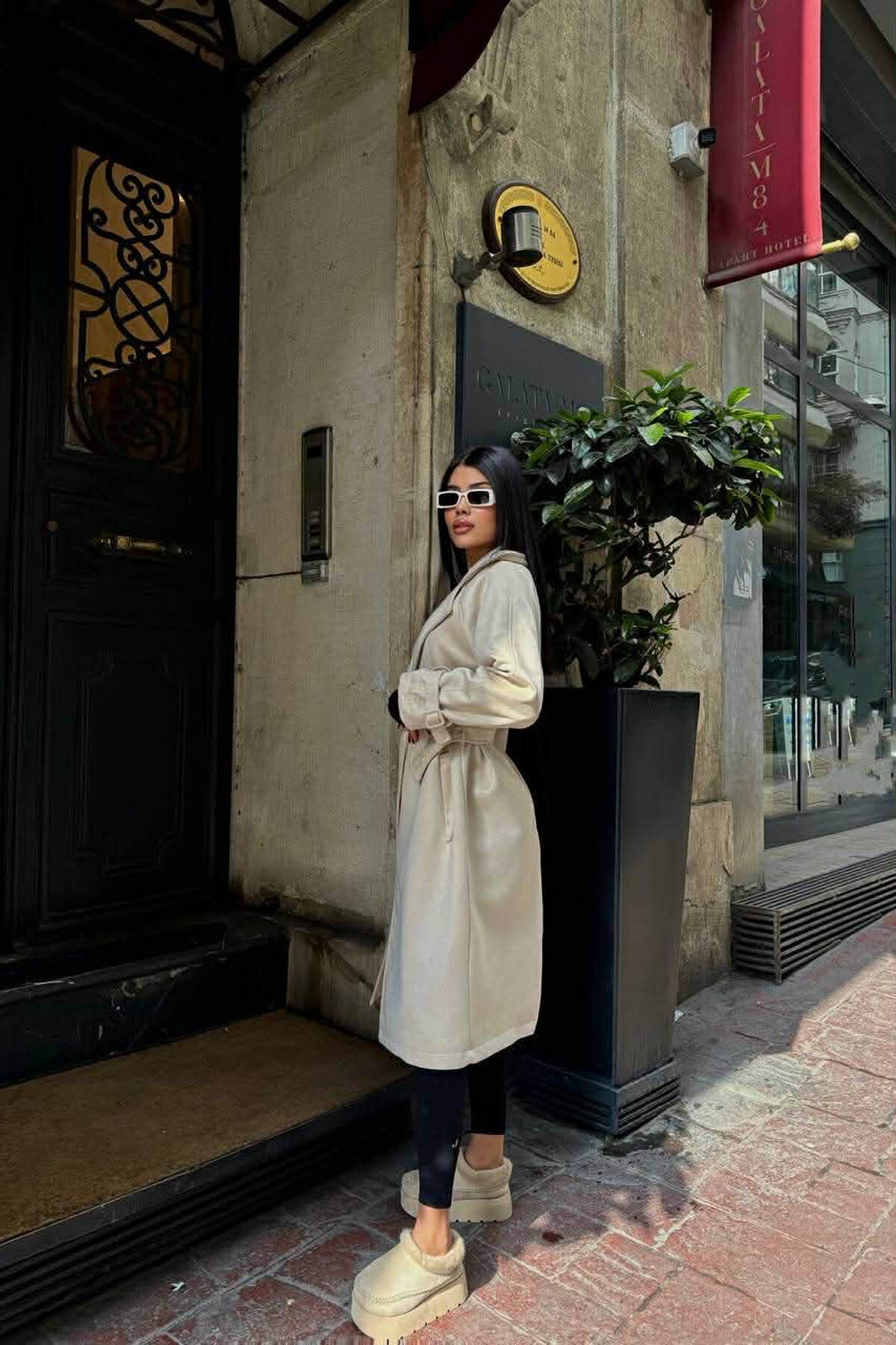 ONE COLOR BELT DETAIL LONG WOMEN COAT BEIGE/BEZHE