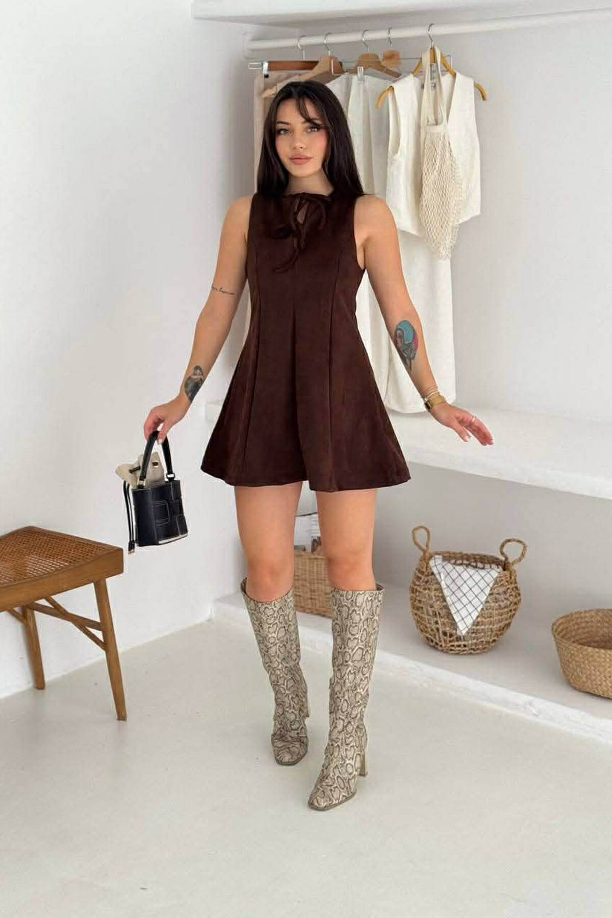 ONE COLOR SUEDE SHORT SLEEVELESS WOMEN DRESS DARK BROWN/KAE