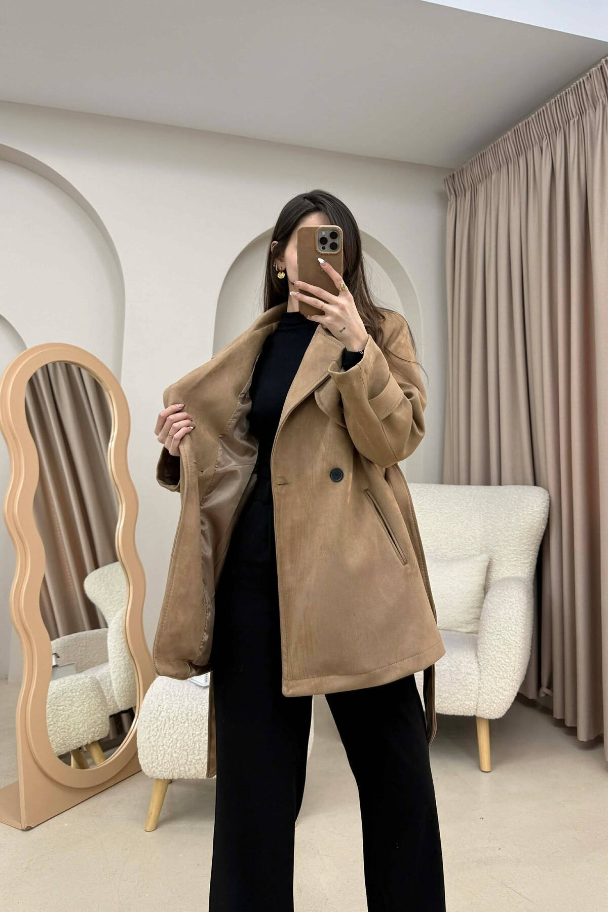 ONE COLOR LEATHER BUTTONED BELT DETAIL LONG WOMAN COAT BROWN/KAFE