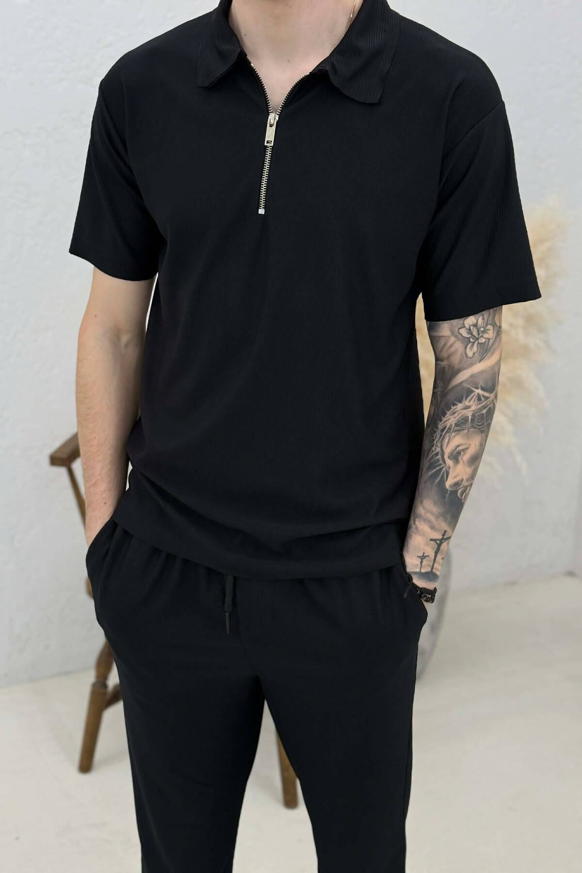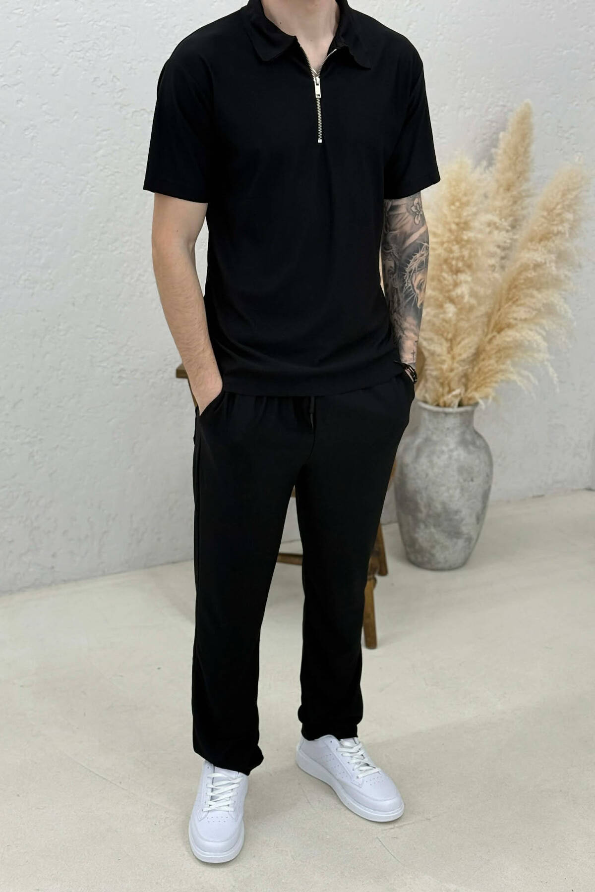 ONE COLOR T-SHIRT + TROUSERS MEN SWEATSUIT SET BLACK/ E ZEZE