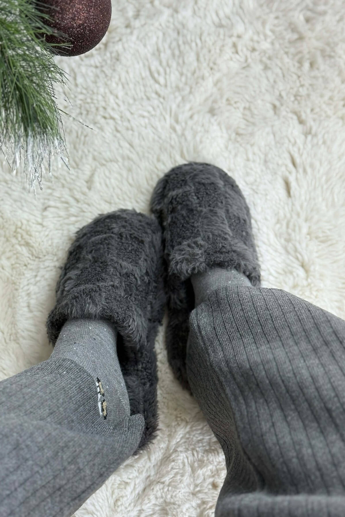 ONE COLOR TEDDY SQUARES WOMEN SLIPPERS DARK GREY/GEE