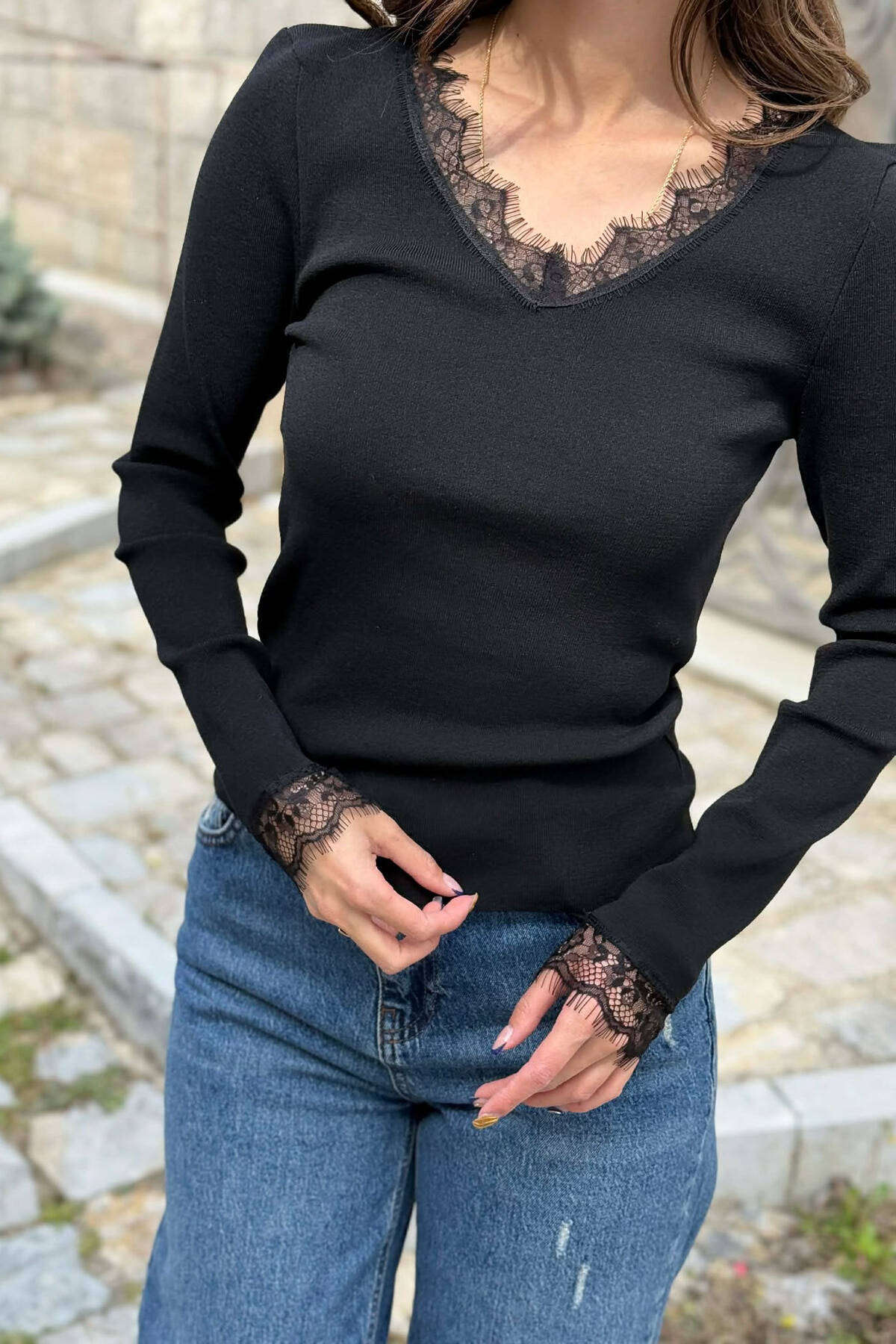 ONE COLOR TULLE DETAIL V NECK WOMEN SWEATER BLACK/ E ZEZE