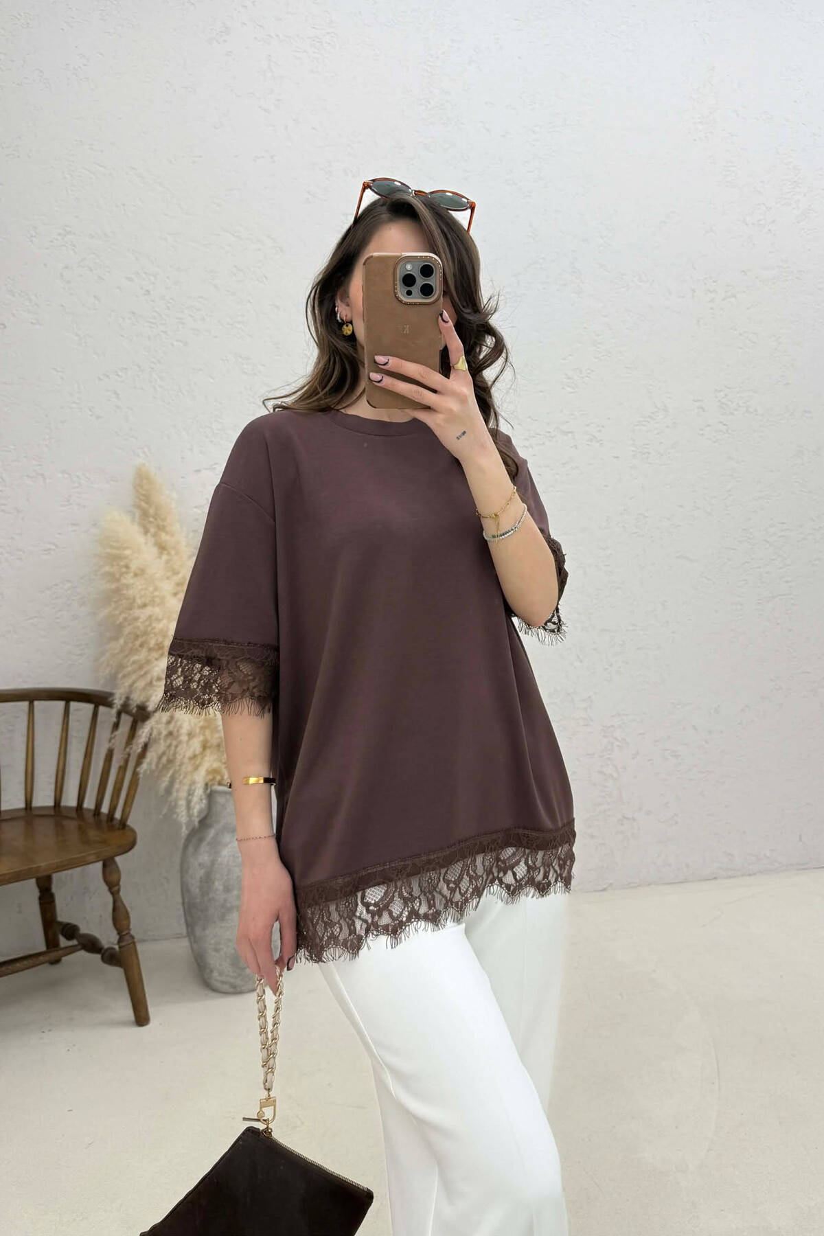 ONE COLOR TULLE DETAIL WOMAN T- SHIRT BROWN/KAFE
