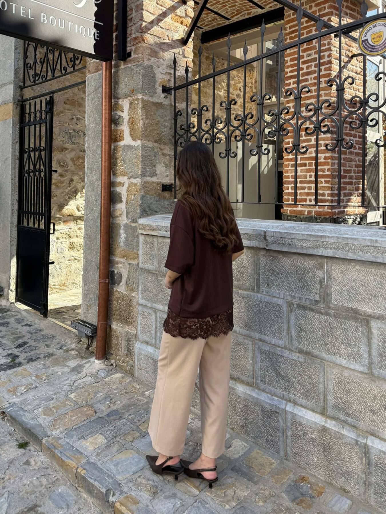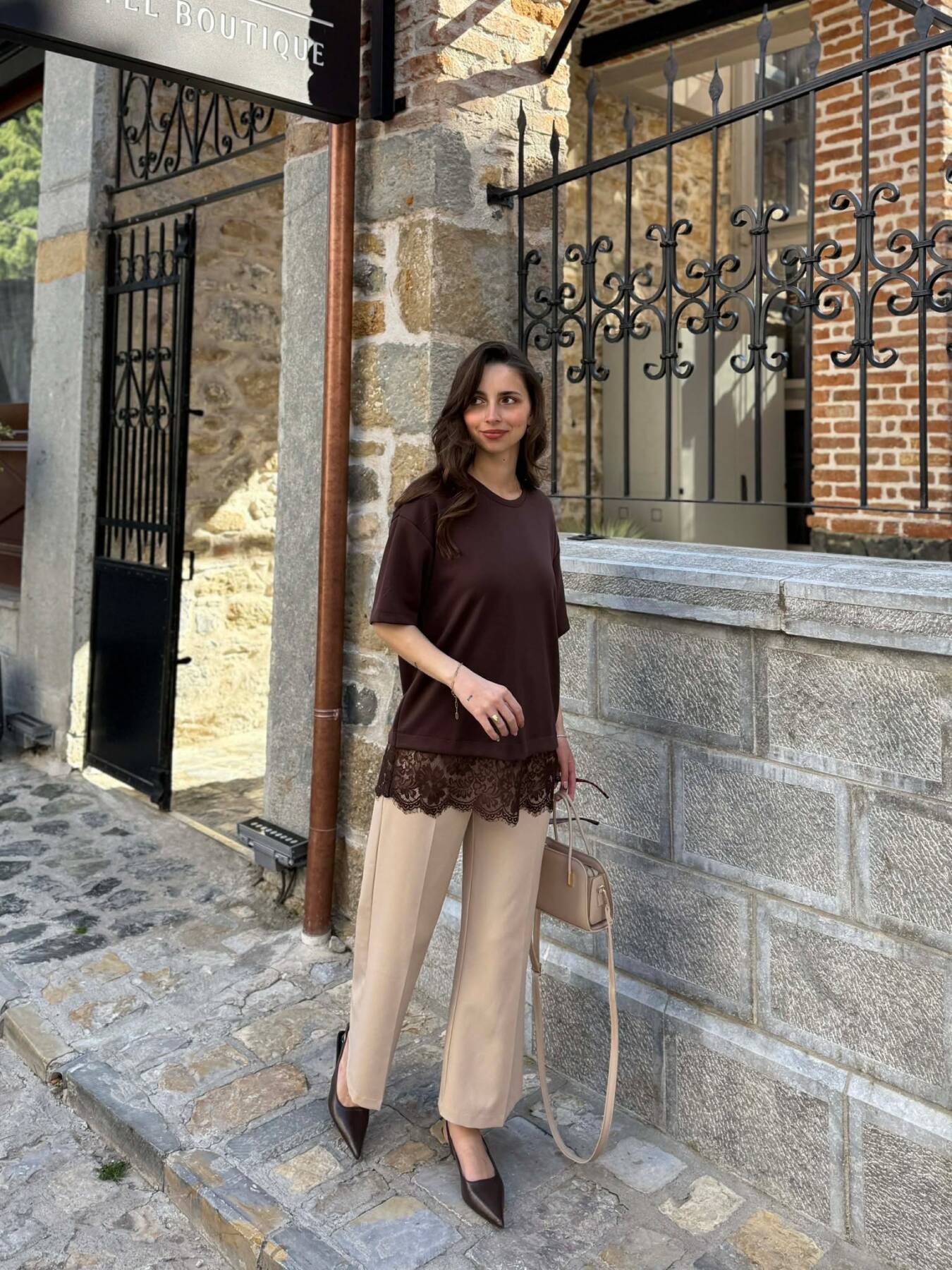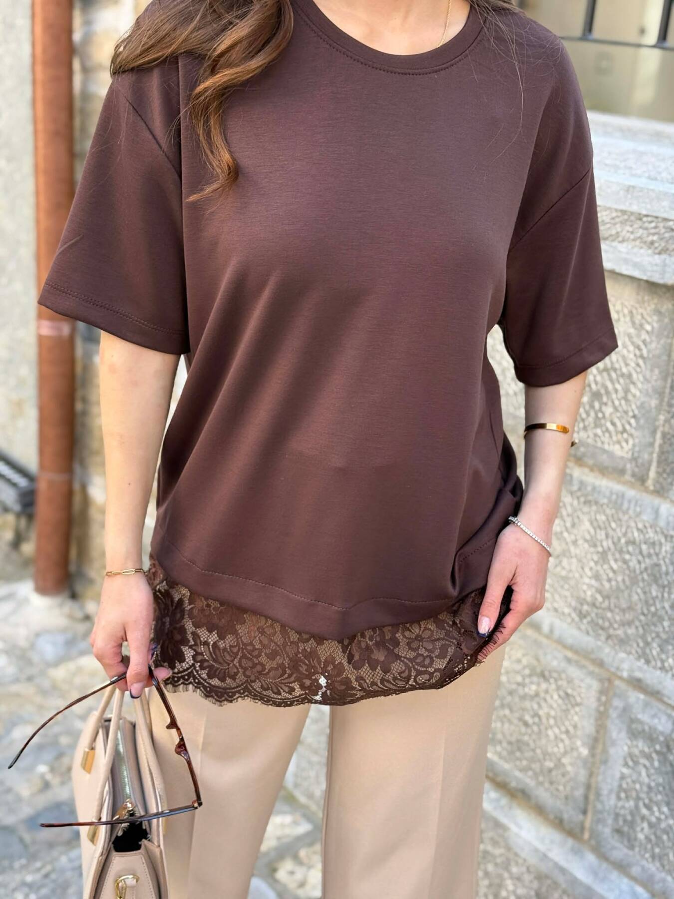 T-SHIRT NJE NGJYRESH ME DETAJ DANTELLE PER FEMRA NE NGJYRE KAFE
