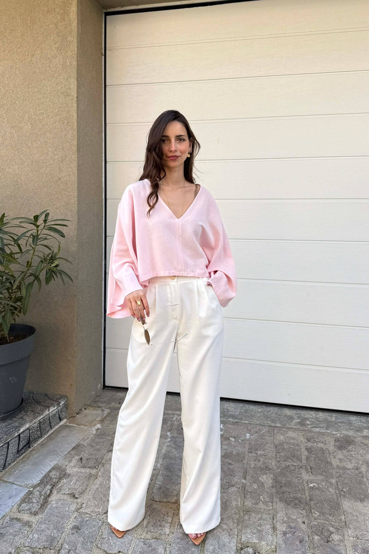 ONE COLOR V-NECK CROP WOMAN SWEATSHIRT PINK/ROZE