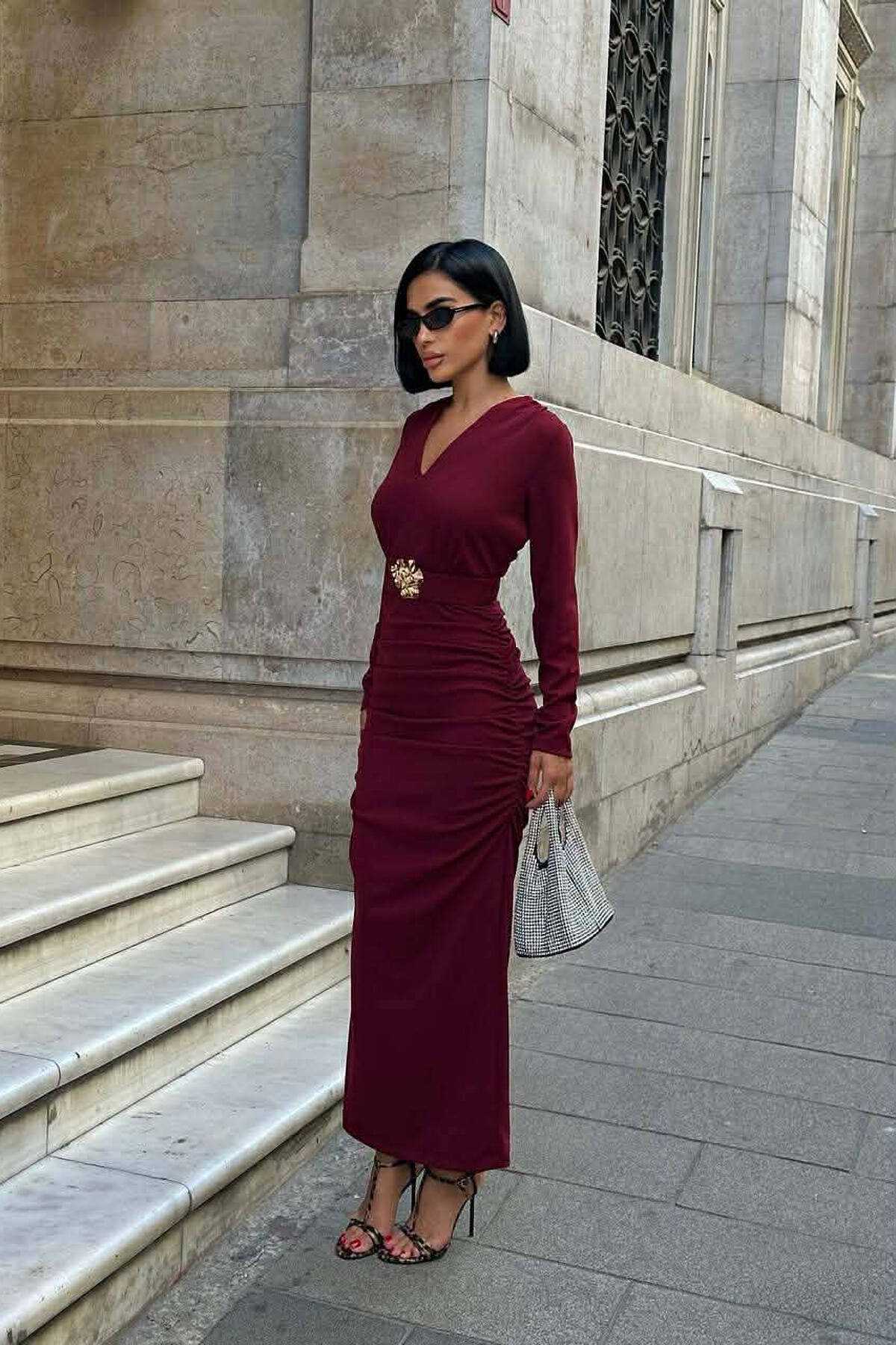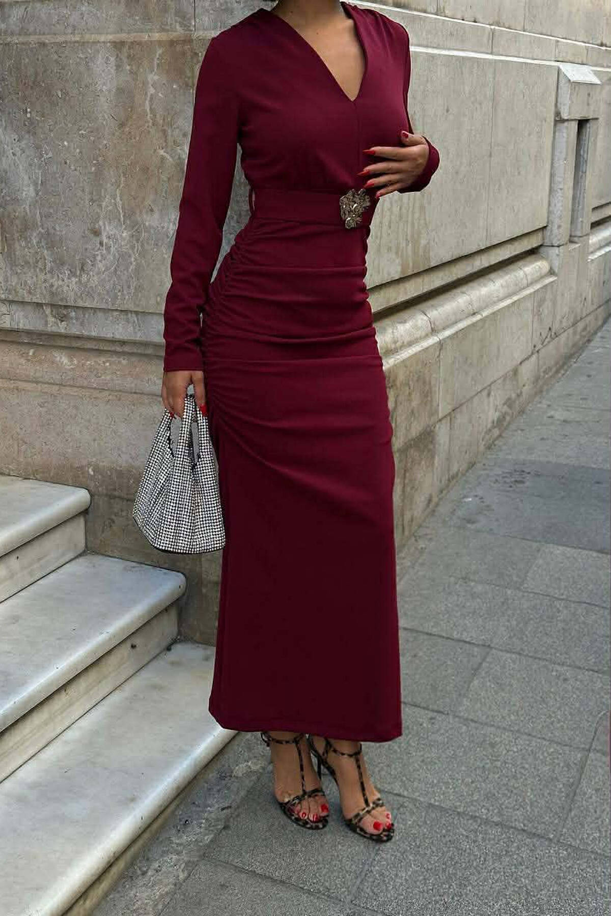 ONE COLOR V NECK GOLD DETAIL BELT LONG WOMEN DRESS BURGUNDY/VISHNJE