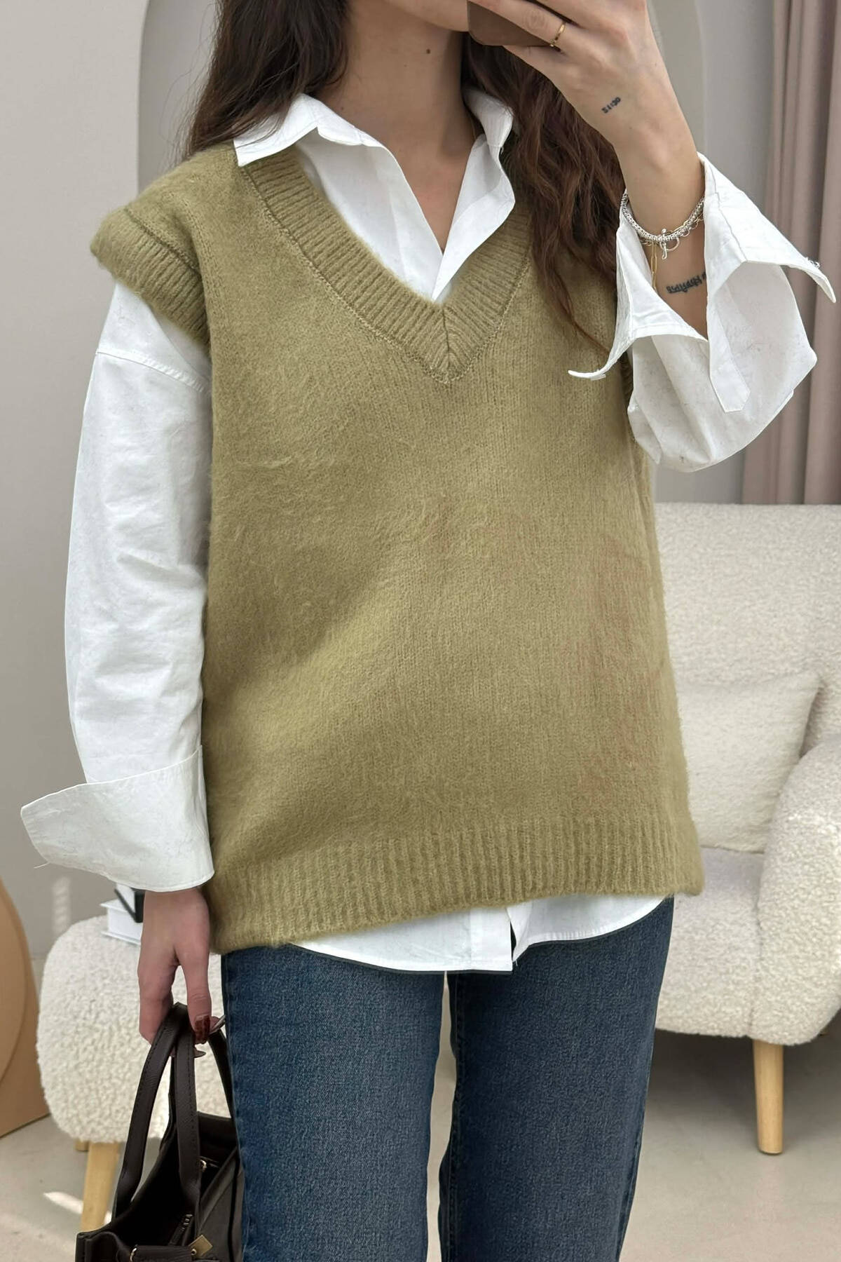 ONE COLOR LEATHER WOMEN VEST OLIVE/ULLI