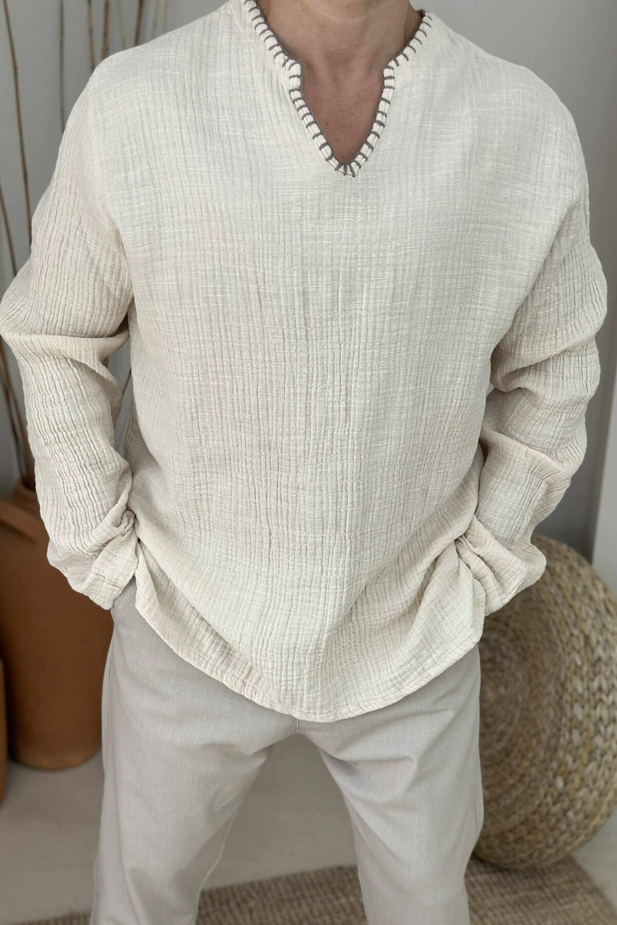 ROUND BUTTONED NECK ONE COLOR MEN SHIRT BEIGE/BEZHE