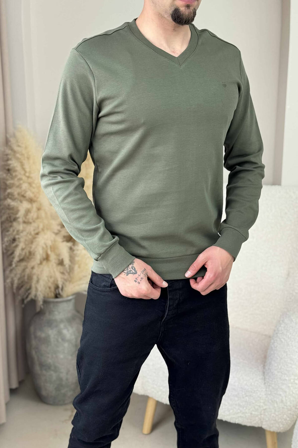 ONE COLOR V NECK SIMPLE MEN SWEATSHIRT GREEN/JESHILE