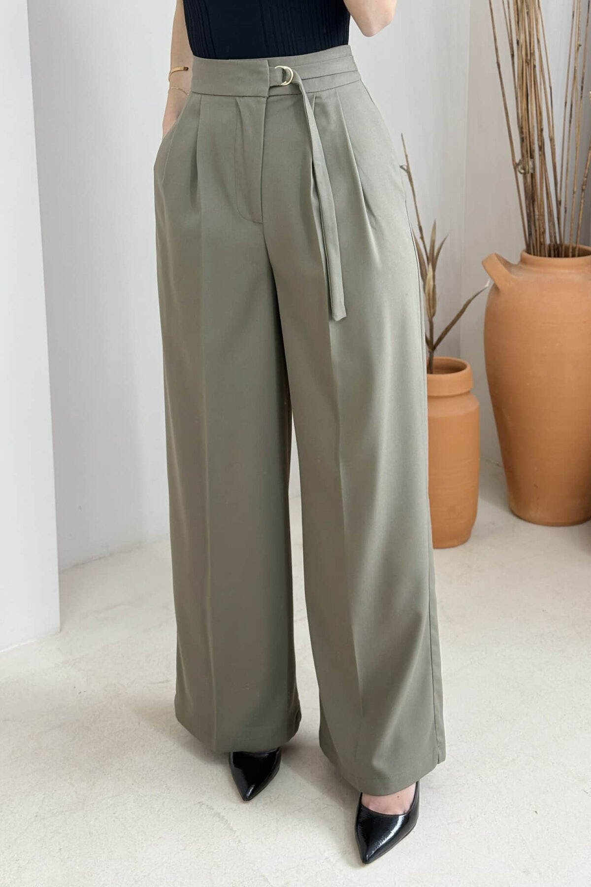 ONE COLOR WIDE LEG BELT WOMEN TROUSERS OLIVE/ULLI