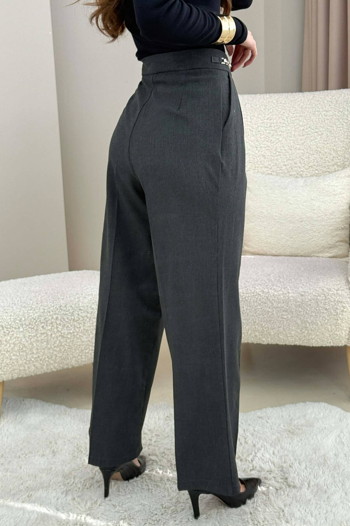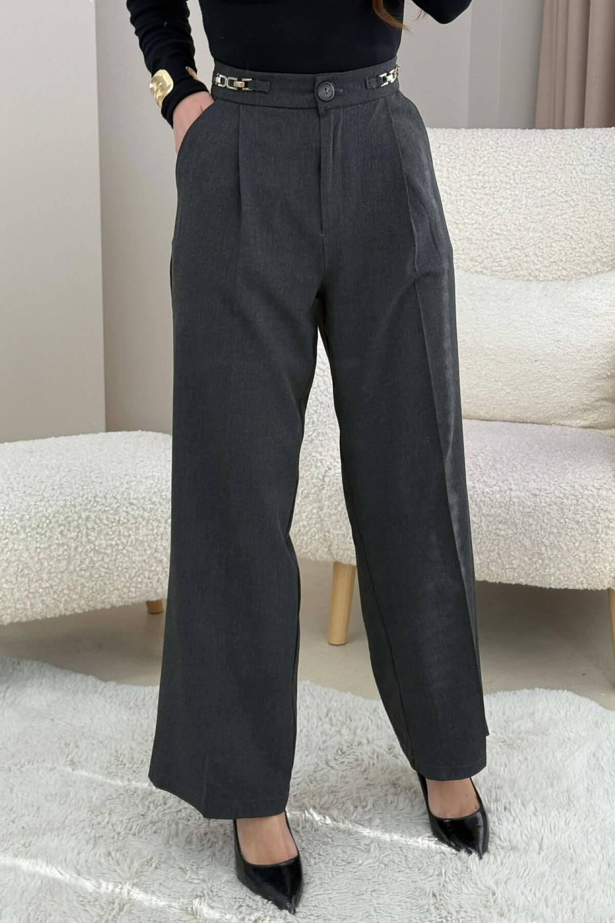 ONE COLOR WIDE LEG CHAIN DETAILS WOMEN TROUSERS DARK GREY/GEE