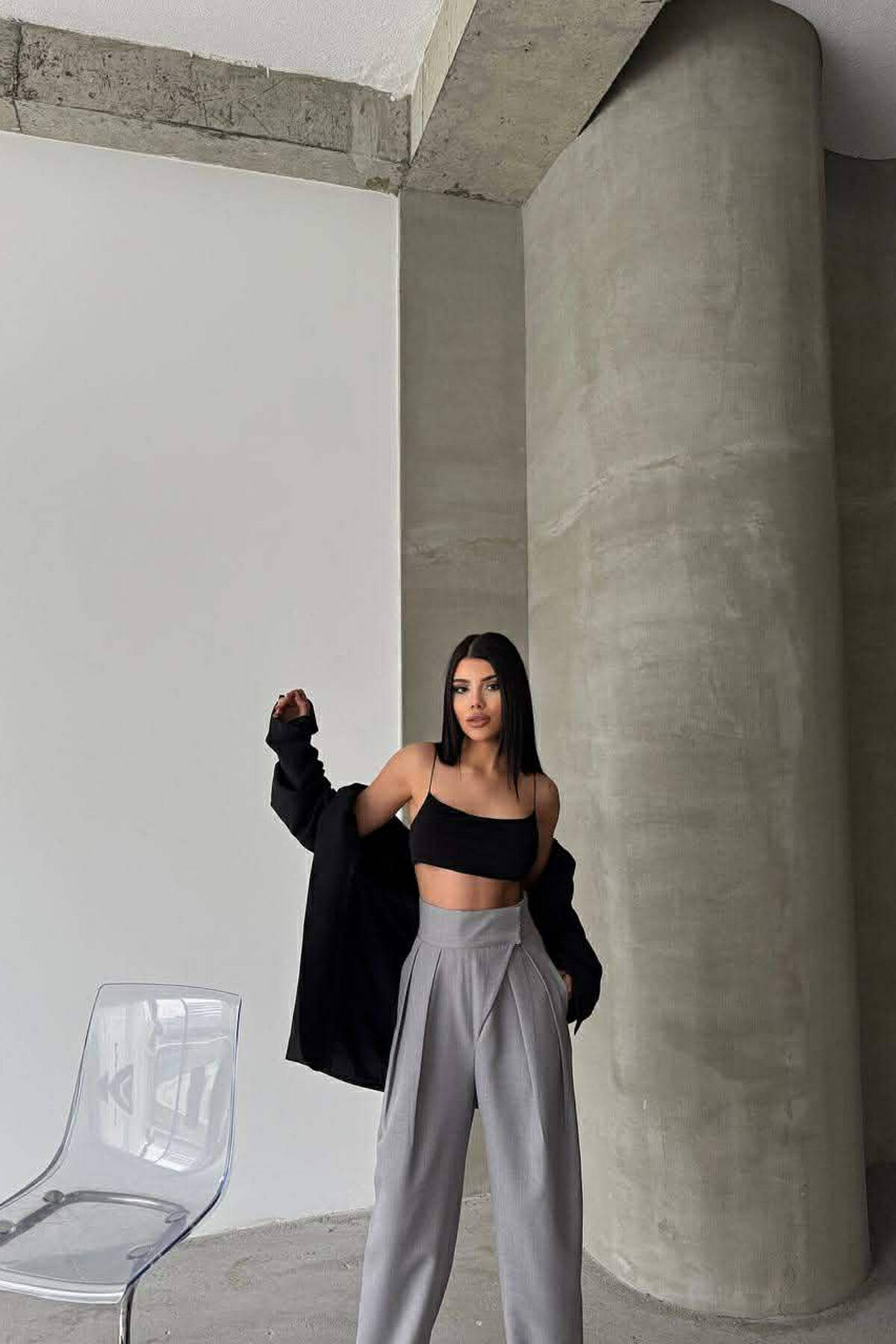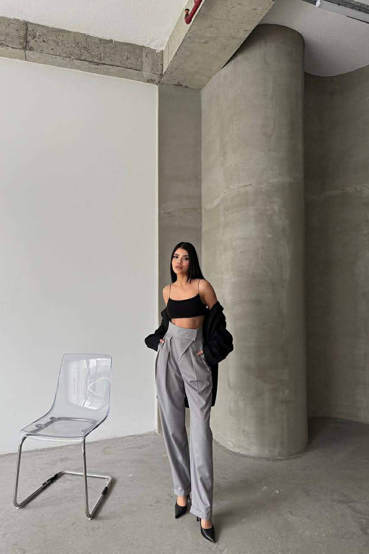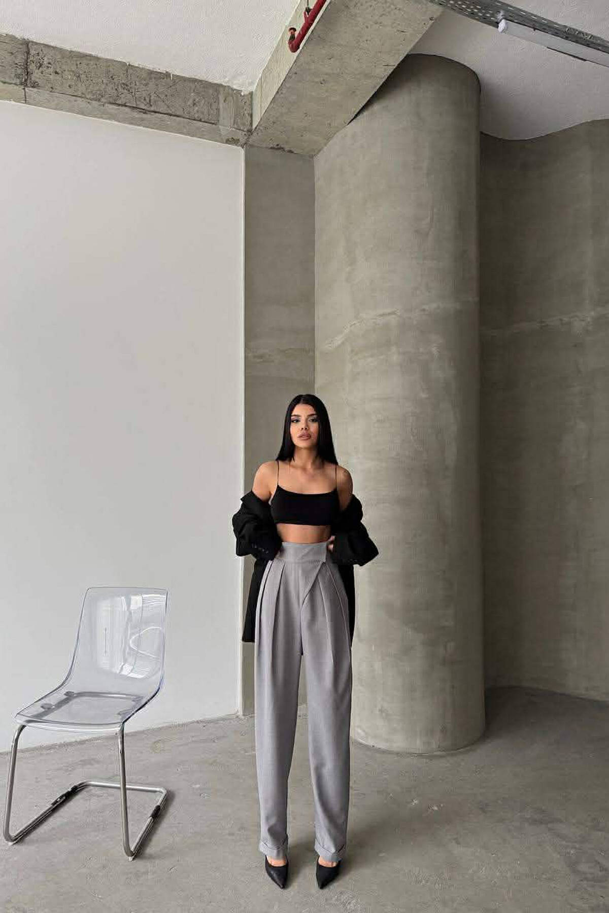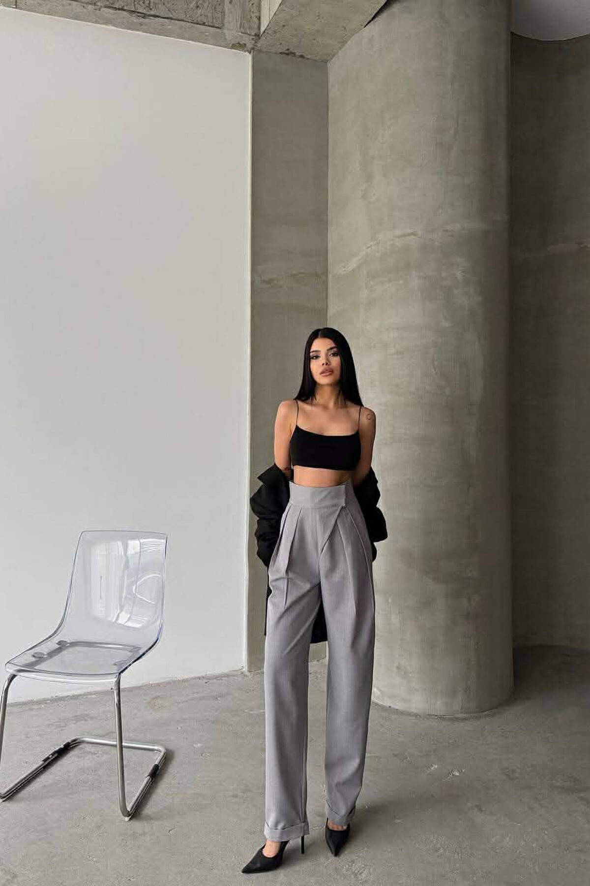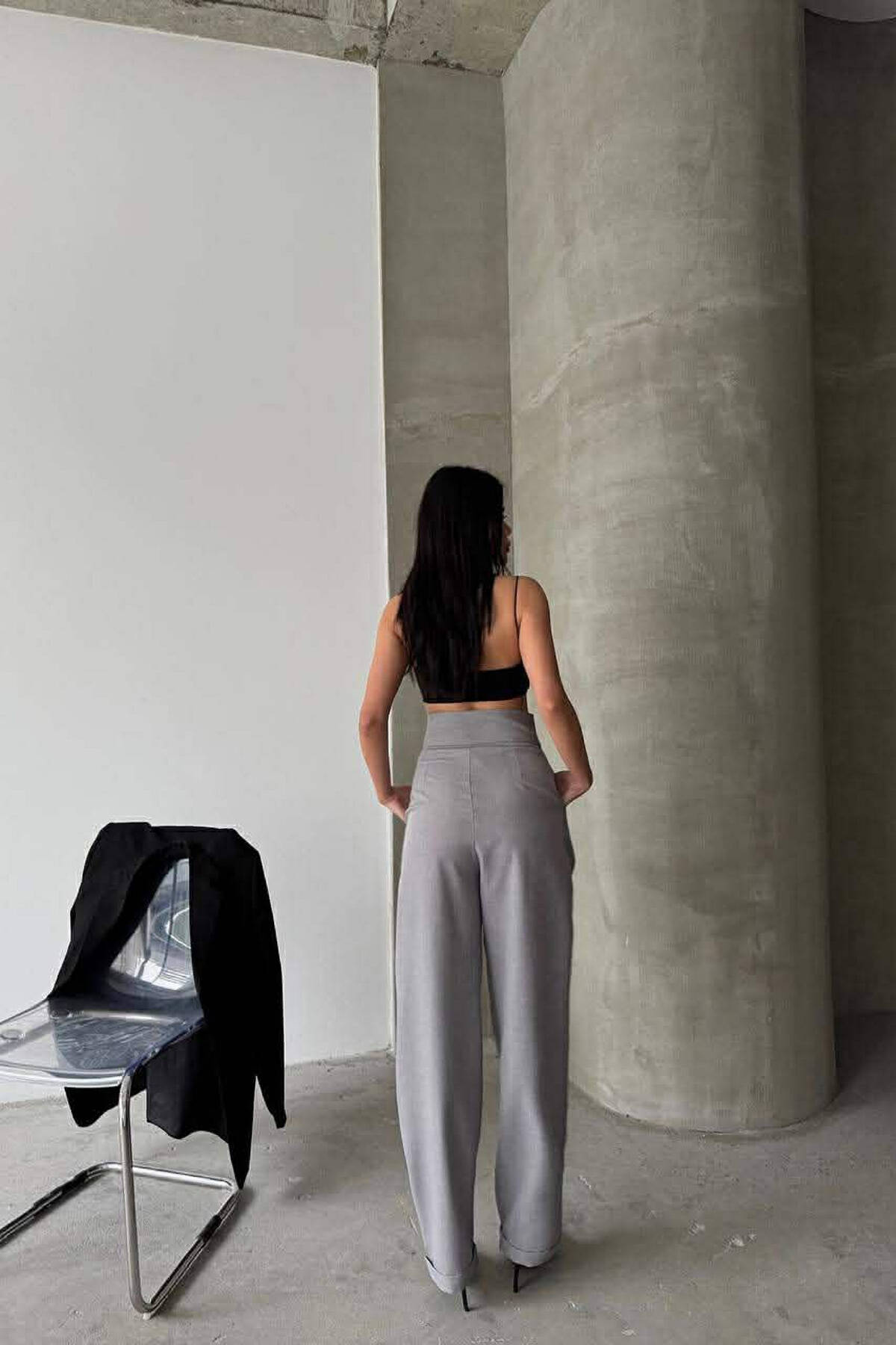 ONE COLOR BELT DETAIL WOMAN TROUSERS DARK GREY/GEE