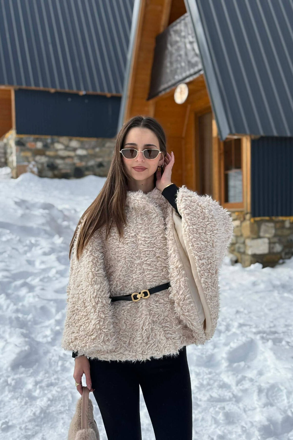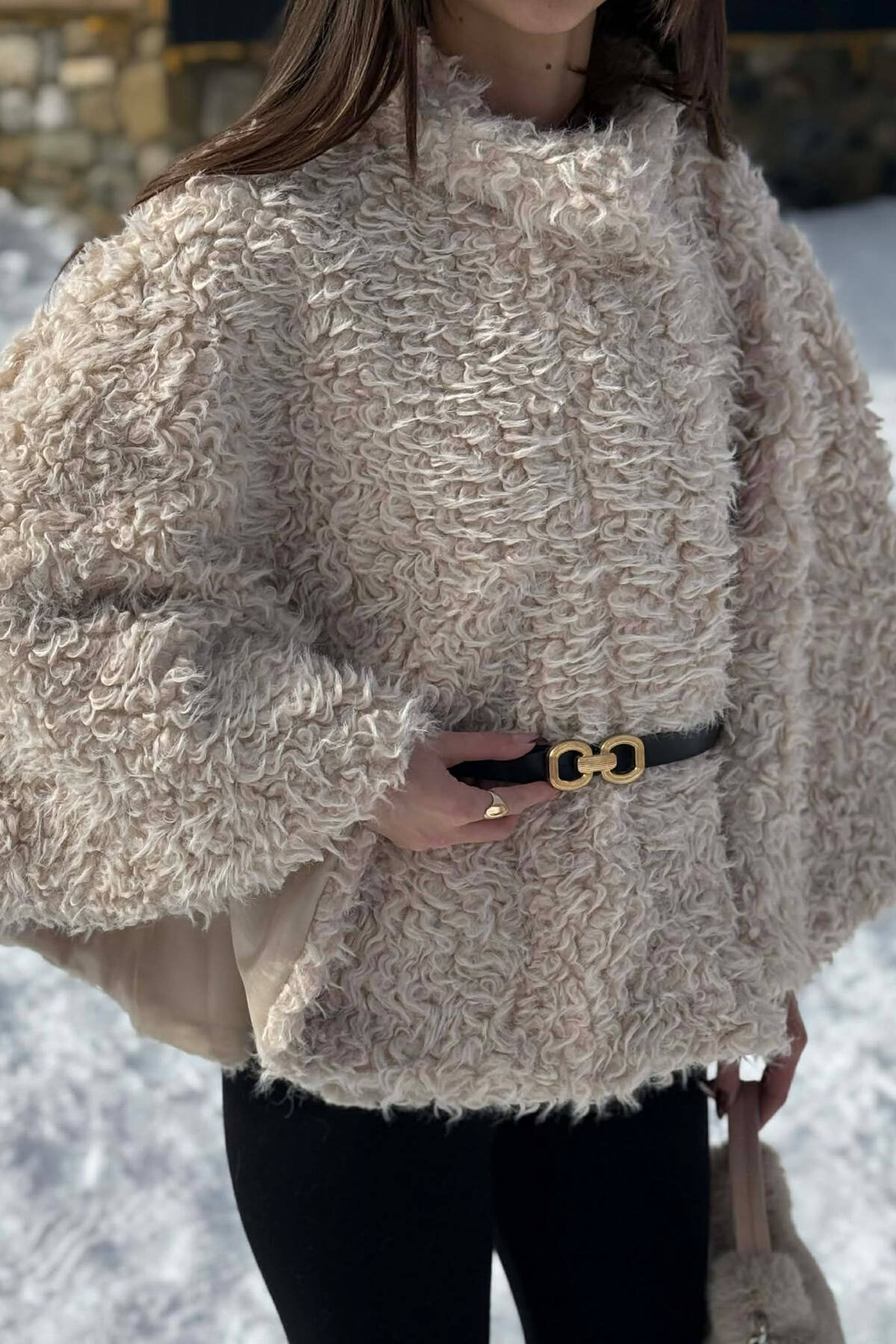 ONE COLOR SHEEP SKIN BELT LONG WOMAN COAT CREAM/KREM