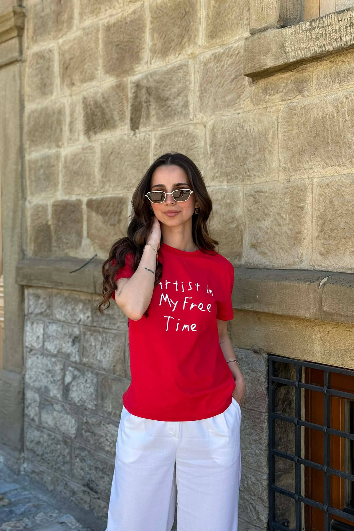 T-SHIRT ME SHKRIM PER FEMRA NE NGJYRE TE KUQE