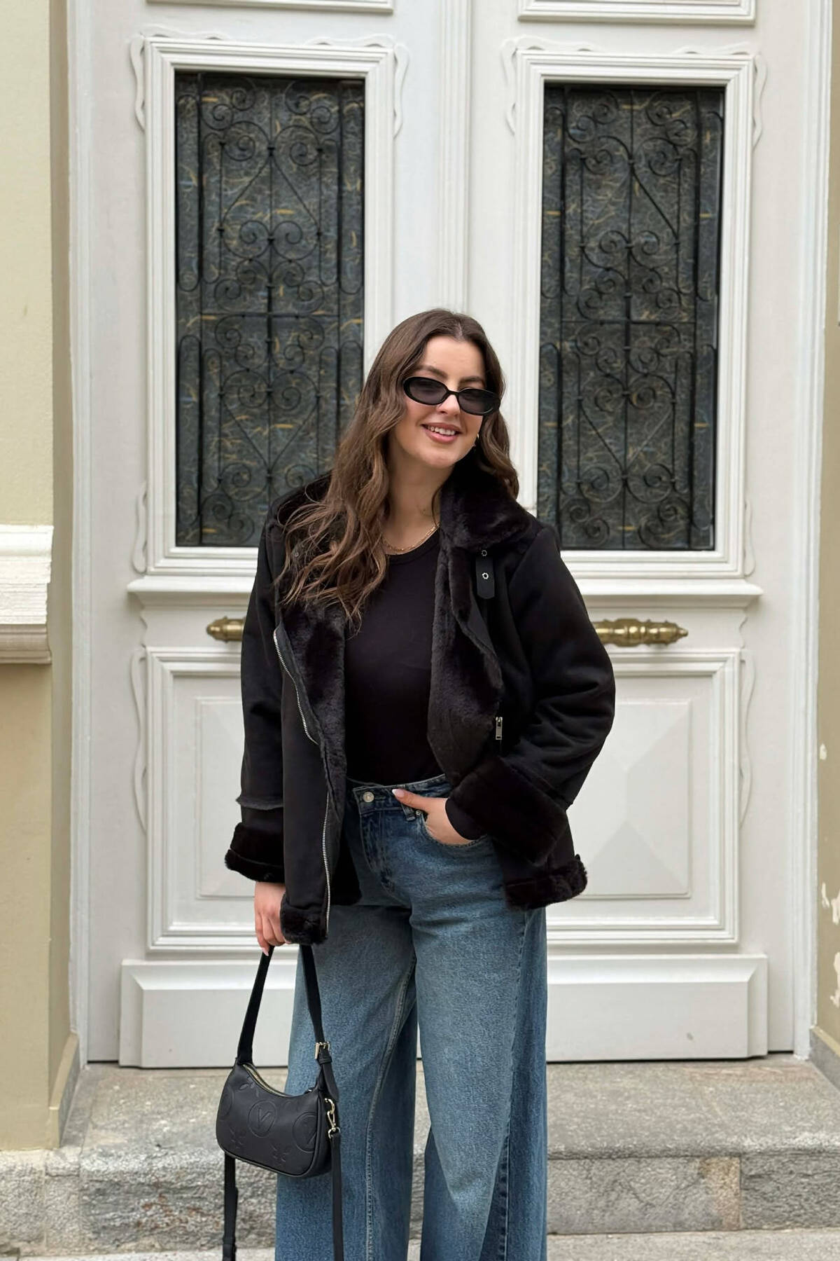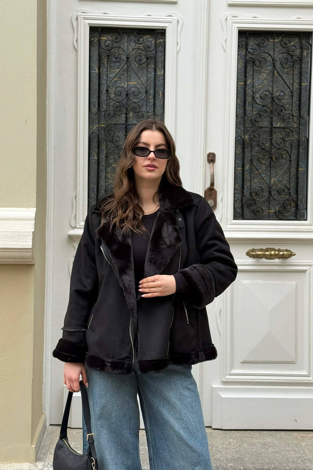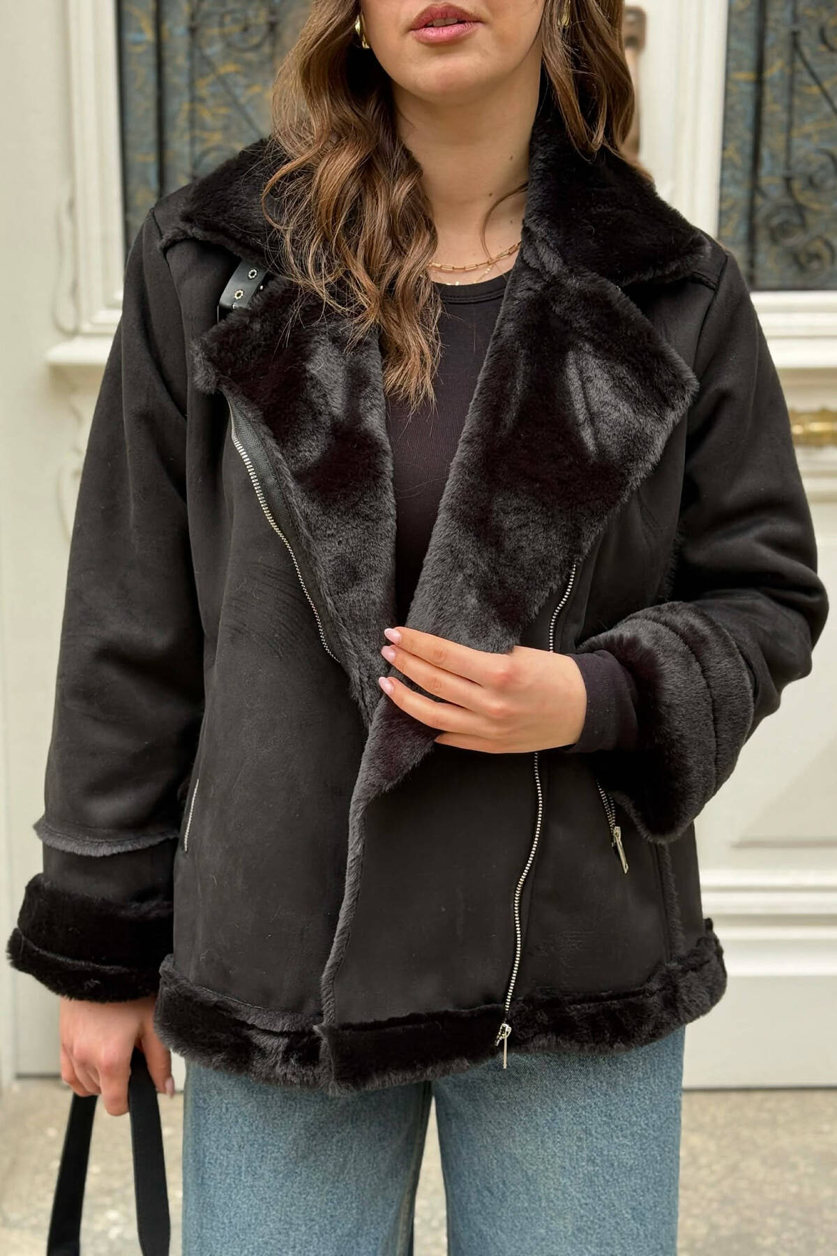 ONE COLOR ZIPPER FLUFFY WOMAN COAT BLACK/ E ZEZE