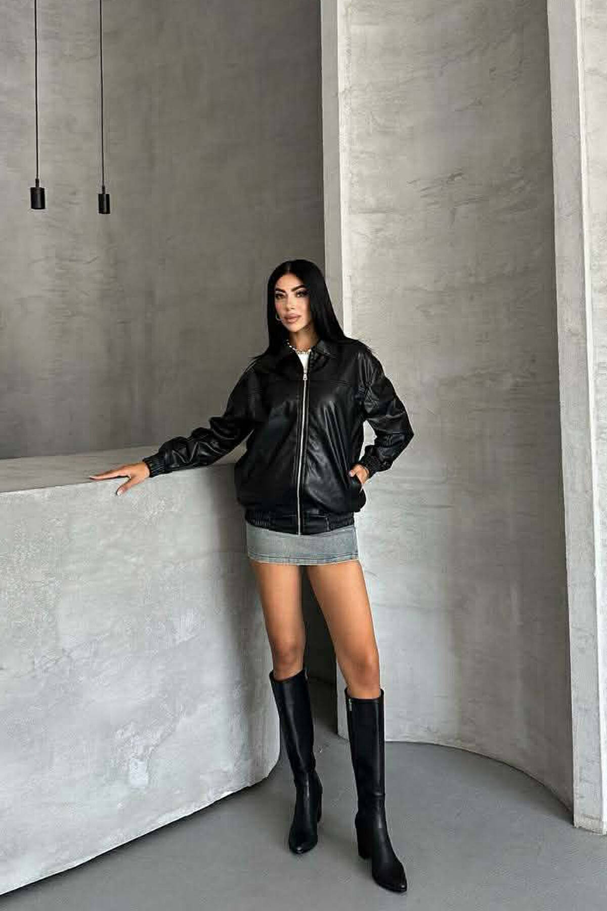 ONE COLOR ZIPPER LEATHER WOMEN JACKET BLACK/ E ZEZE