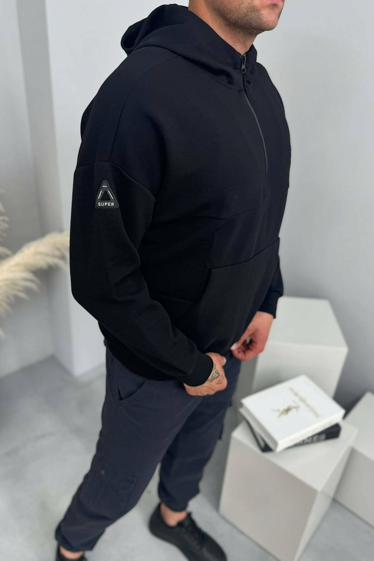 ONE COLOR ZIPPER NECK MEN HOODIE BLACK/ E ZEZE