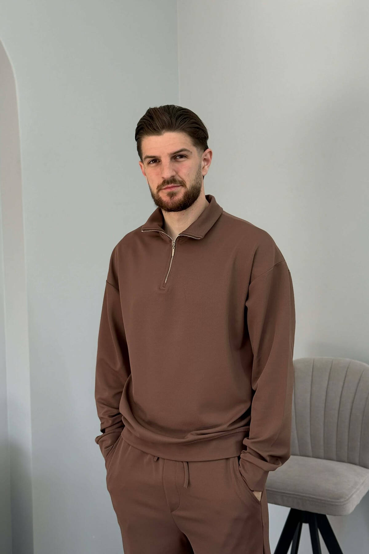 ONE COLOR ZIPPER NECK SWEATSHIRT + SWEATPANTS MEN SET BROWN/KAFE