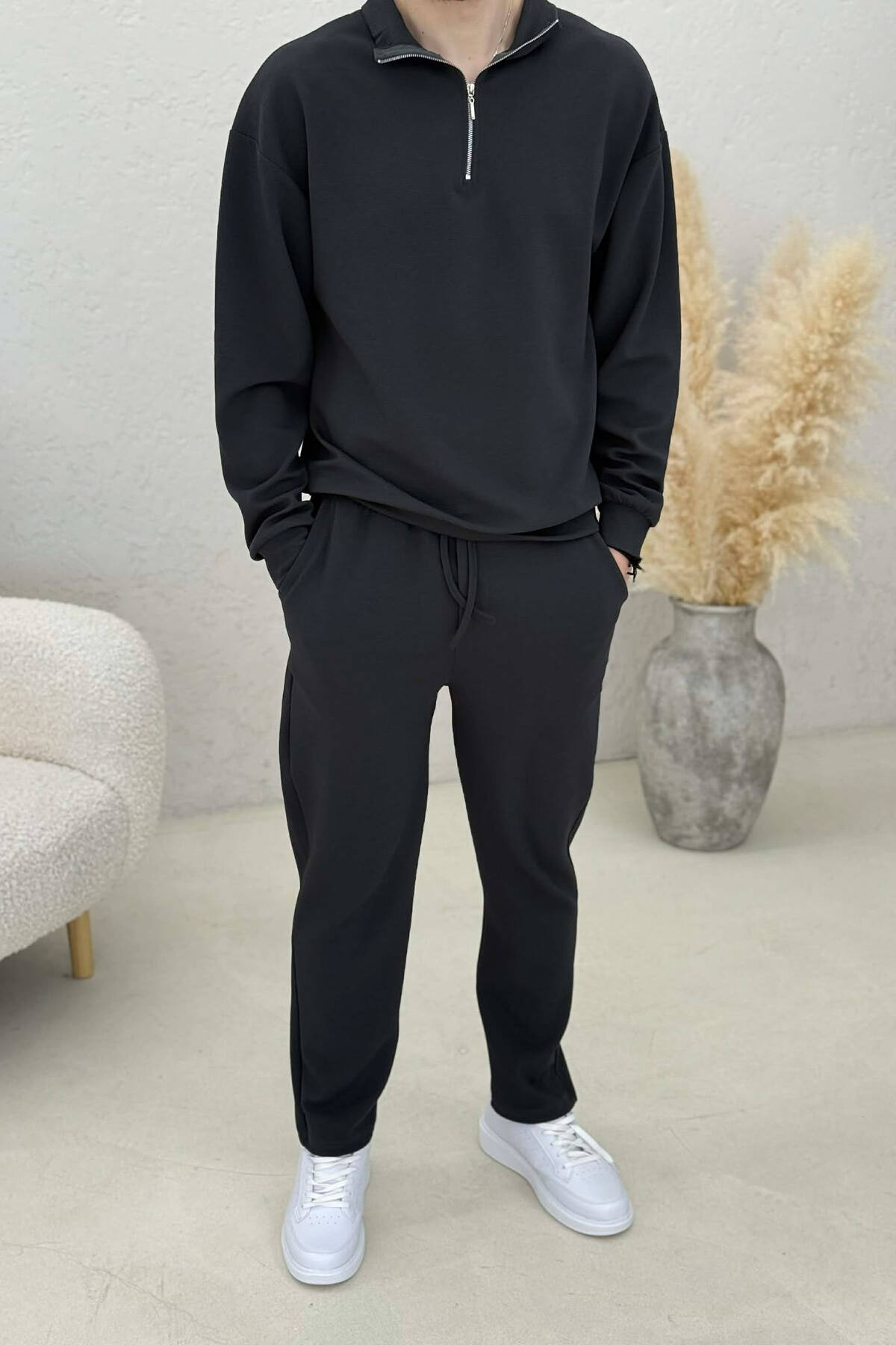 ONE COLOR ZIPPER NECK SWEATSHIRT + SWEATPANTS MEN SET BLACK/ E ZEZE