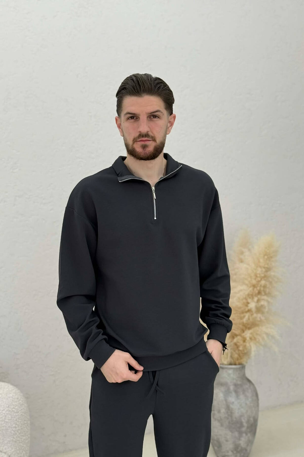 ONE COLOR ZIPPER NECK SWEATSHIRT+ SWEATPANTS MEN SET DARK GREY/GEE