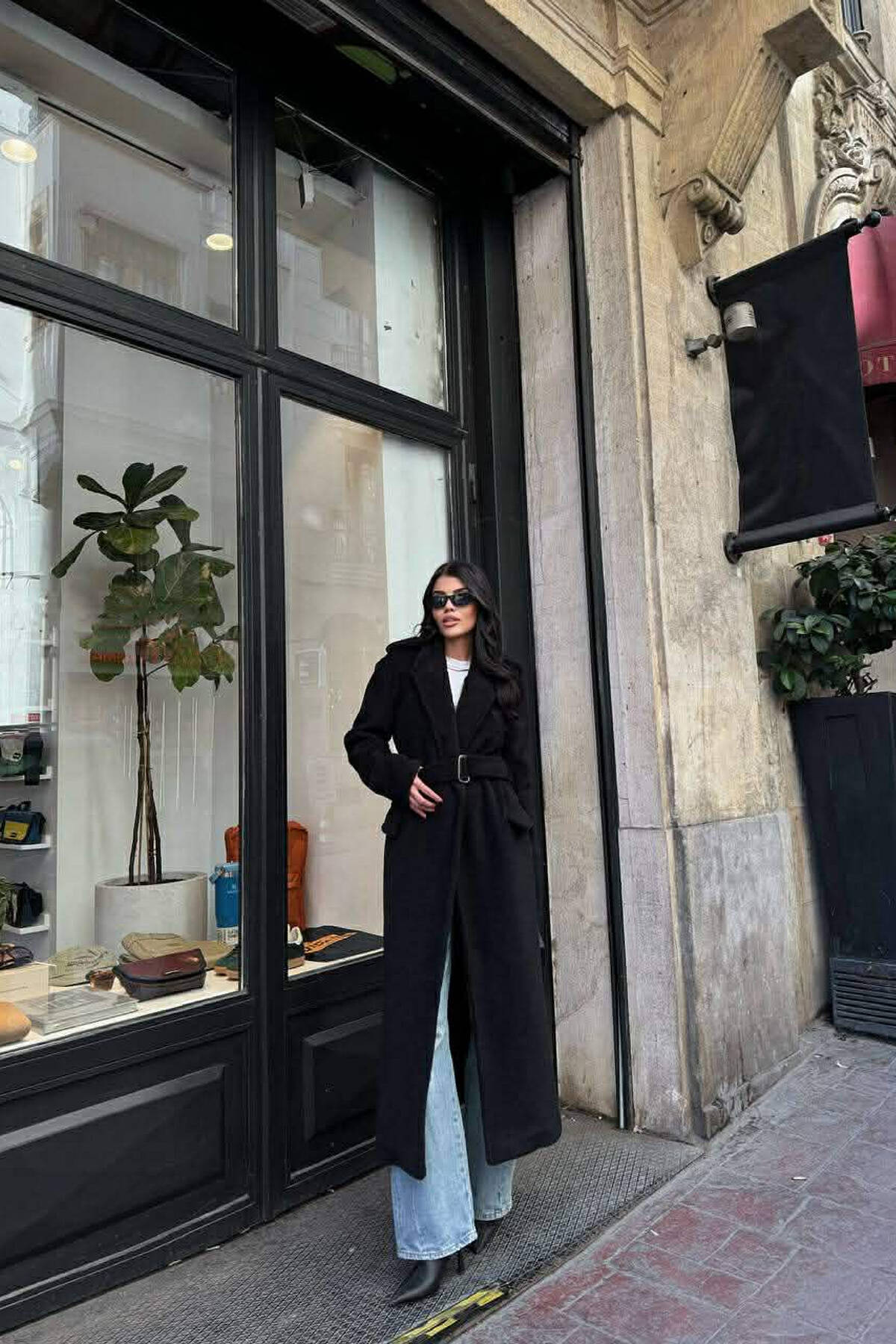 LONG SIMPLE BELT DETAIL WOMEN TRENCH COAT BLACK-BEIGE/ZEBE