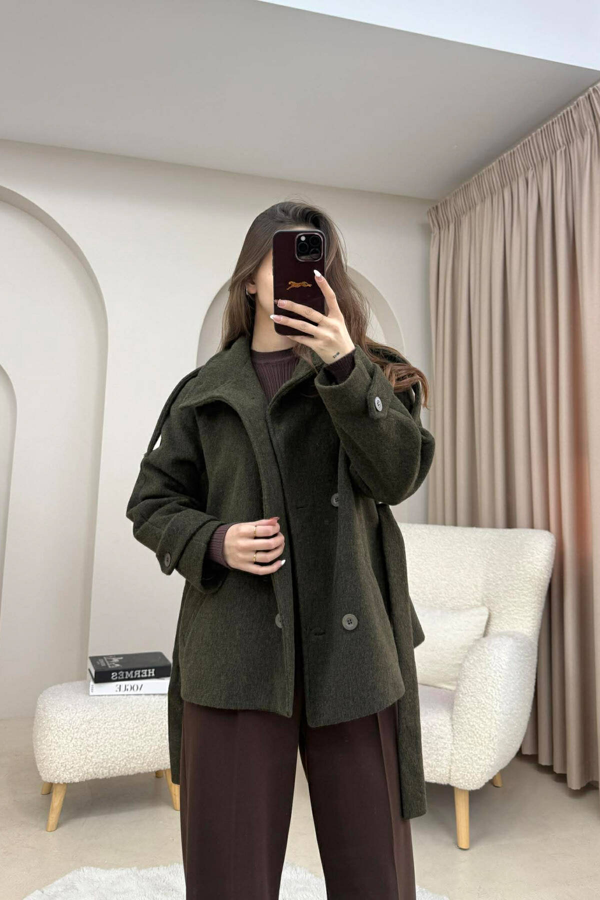 PALLTO NJE NGJYRESHE LEKURE ME KOPSA DHE ME DETAJIN E RRIPIT NE NGJYRE KAFE