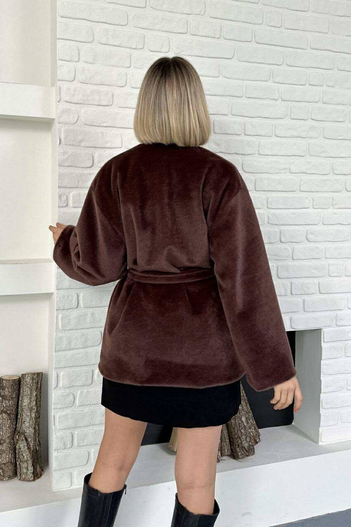 PALLTO NJË NGJYRËSHE ME GËZOF DHE LIDHËSE PËR FEMRA NË NGJYRË KAFE TË ERRËT