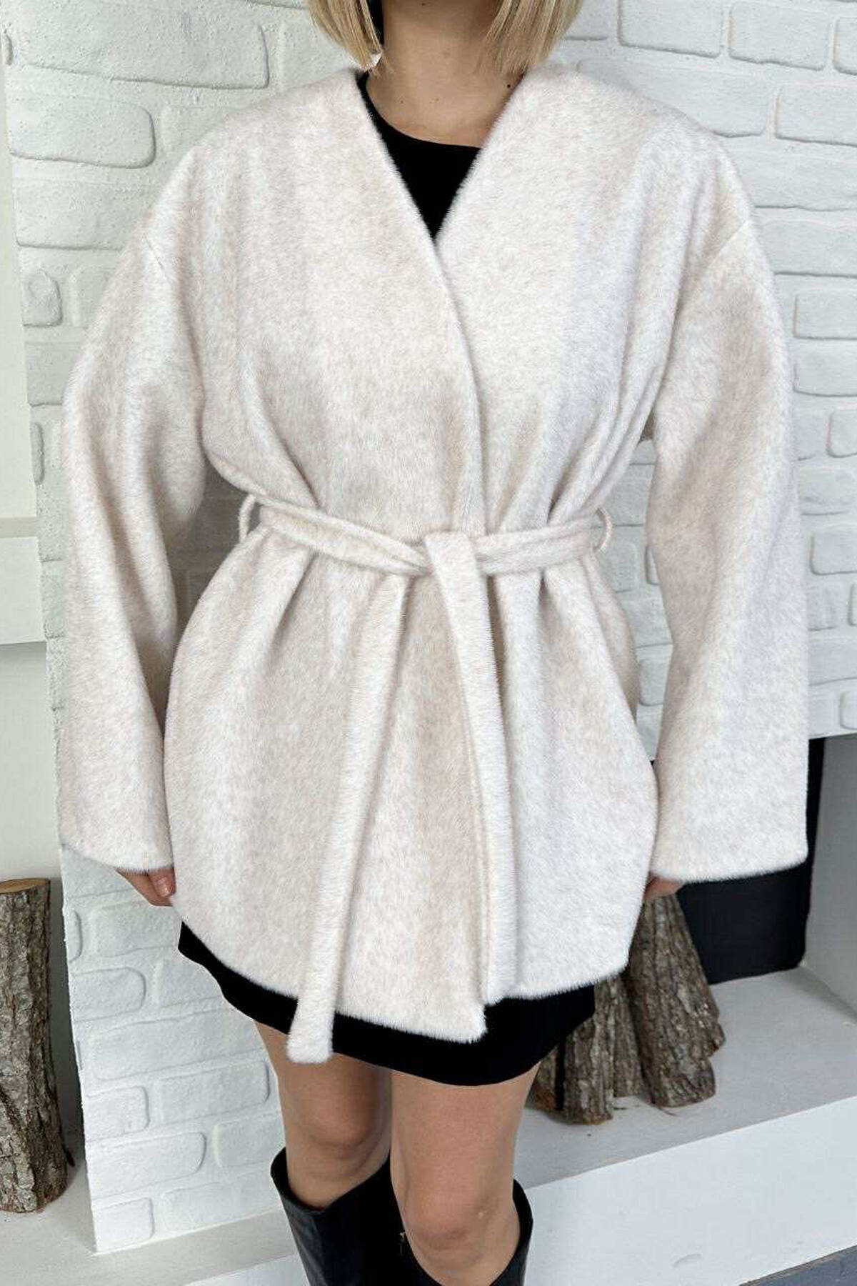 PALLTO NJË NGJYRËSHE ME GËZOF DHE LIDHËSE PËR FEMRA NË NGJYRË KREM