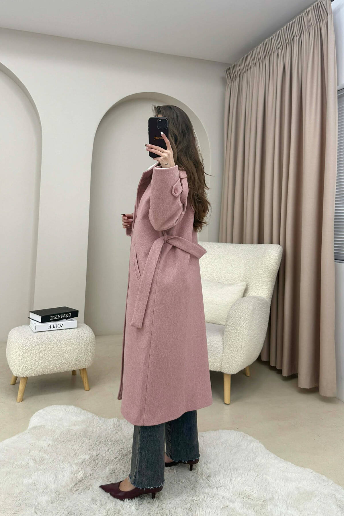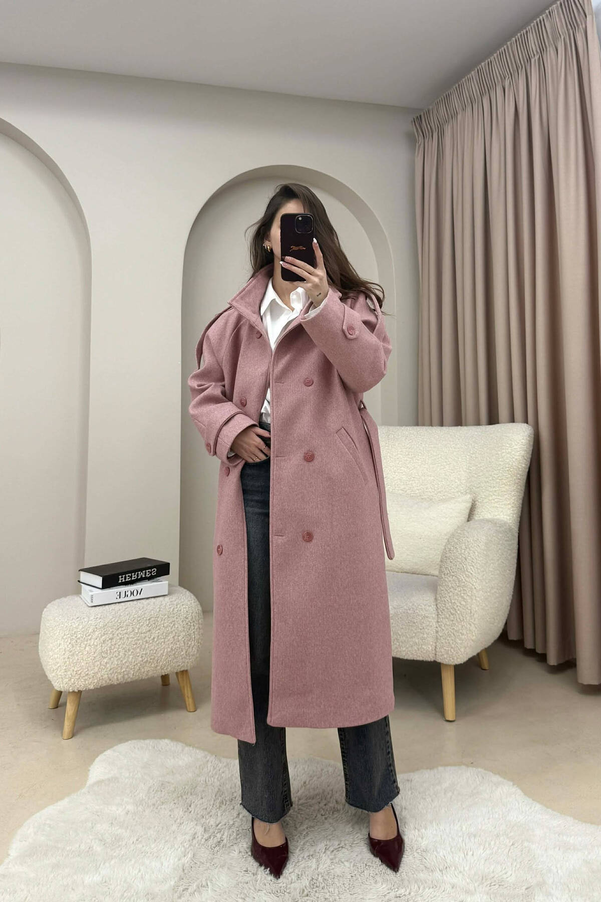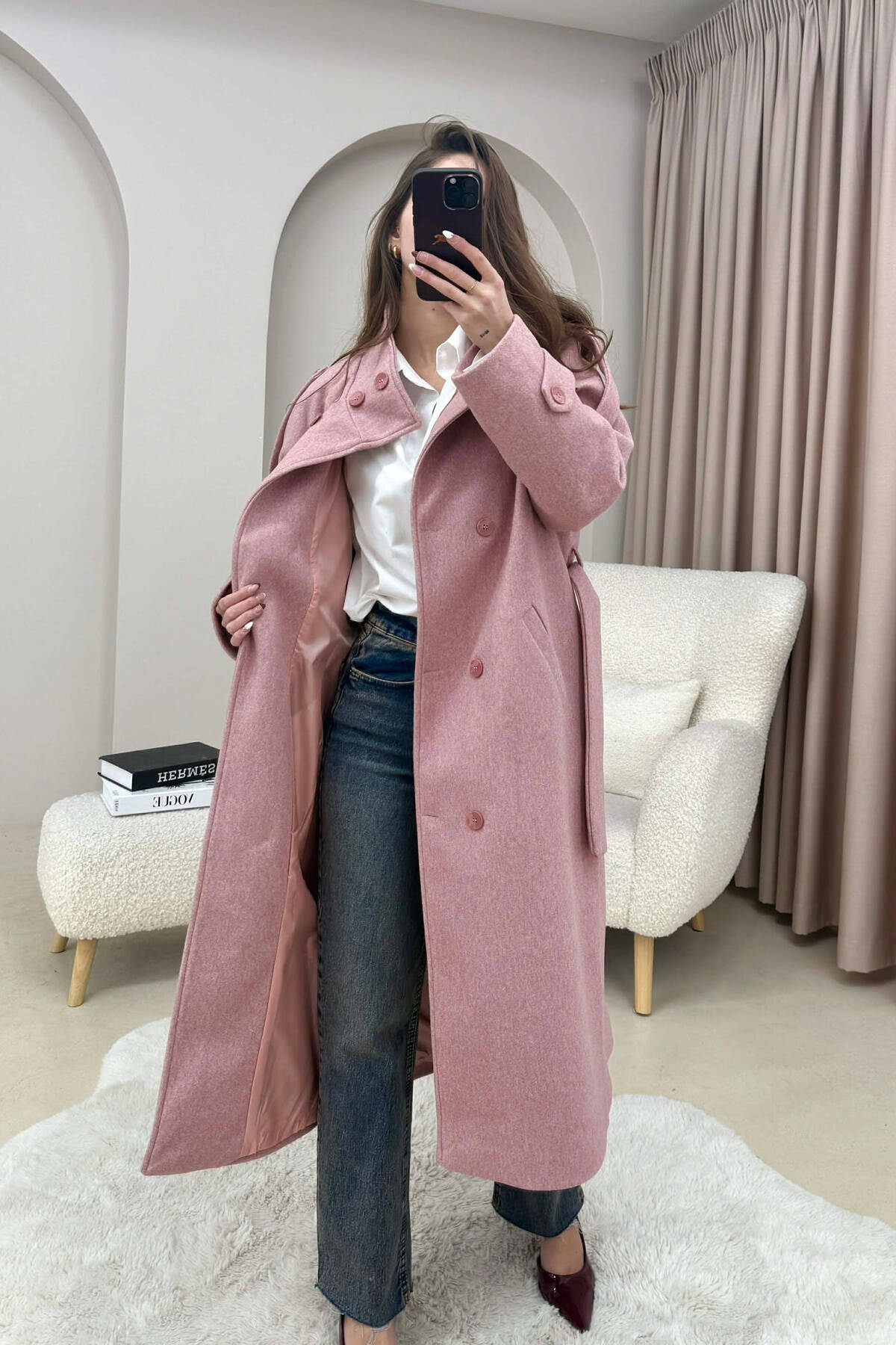 PALLTO NJE NGJYRESHE ME JAKE TE GJATE DHE BUTONA PER FEMRA NE NGJYRE UTHULL
